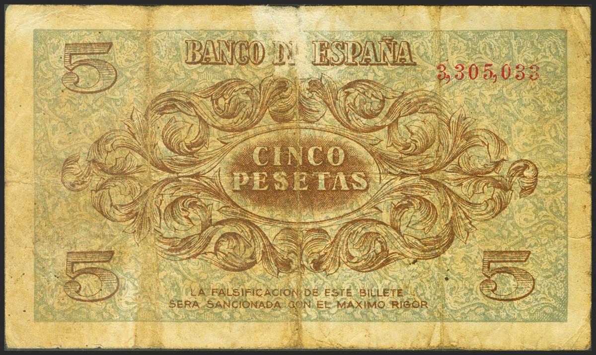 5 Pesetas. 21 de Noviembre de 1936. Sin serie. (Edifil 2021: 417). Inusual, sin reparaciones. MBC-.