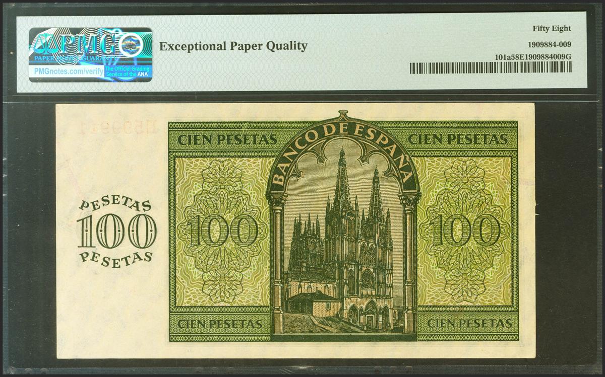 100 Pesetas. 21 de Noviembre de 1936. Serie E. (Edifil 2021: 421a, Pick: 101a). Apresto original. EBC+++. Encapsulado PMG58EPQ.