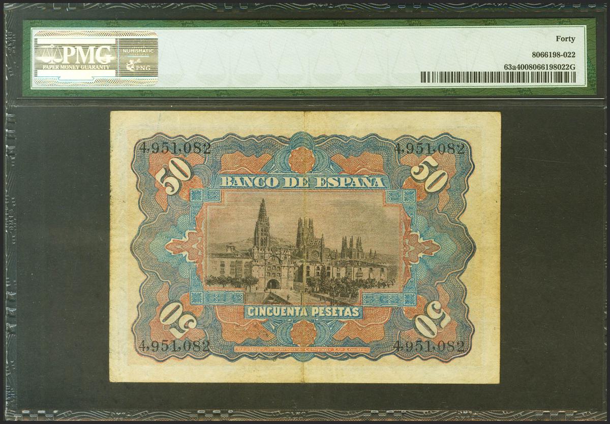 50 Pesetas. 15 de Julio de 1907. Sin serie. (Edifil 2021: 319, Pick: 63a). EBC-. Encapsulado PMG40.