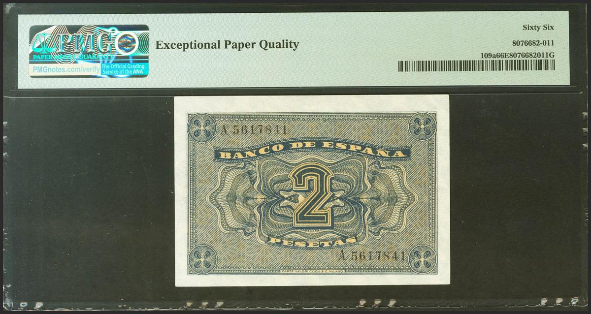 2 Pesetas. 30 de Abril de 1938. Serie A. (Edifil 2021: 429, Pick: 109a). Inusual en esta excepcional calidad, apresto original. SC. Encapsulado PMG66EPQ.