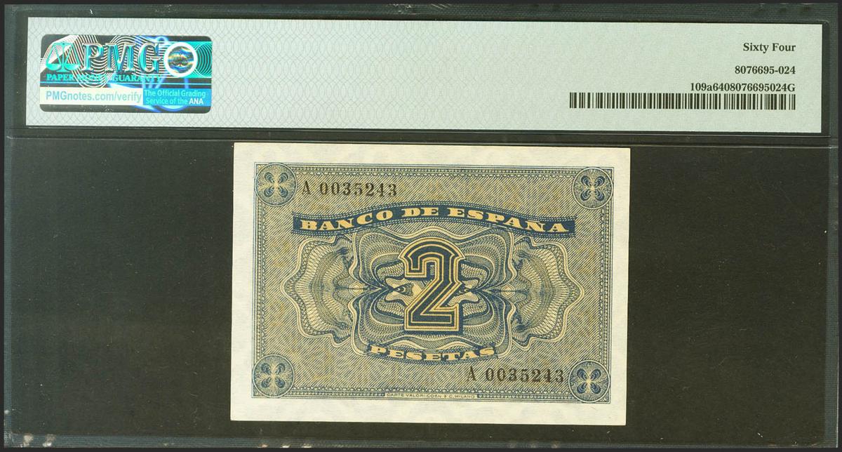 2 Pesetas. 30 de Abril de 1938. Serie A. (Edifil 2021: 429, Pick: 109a). SC. Encapsulado PMG64.