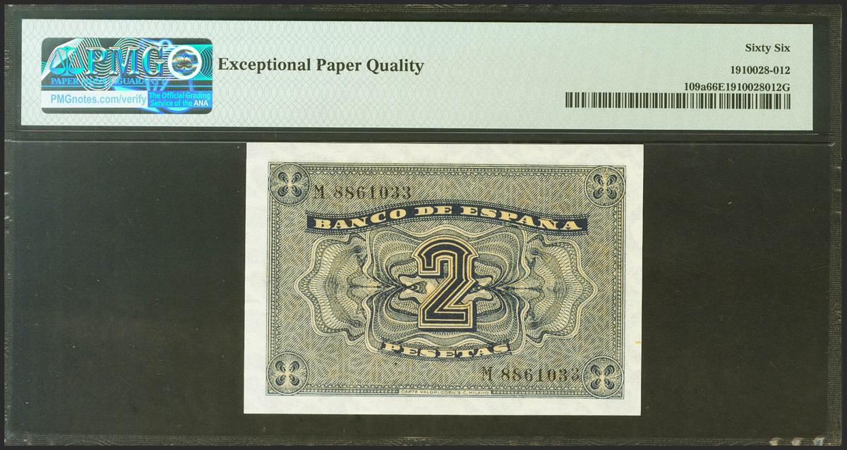 2 Pesetas. 30 de Abril de 1938. Serie M. (Edifil 2021: 429a, Pick: 109a). Inusual en esta calidad, apresto original. SC. Encapsulado PMG66EPQ.