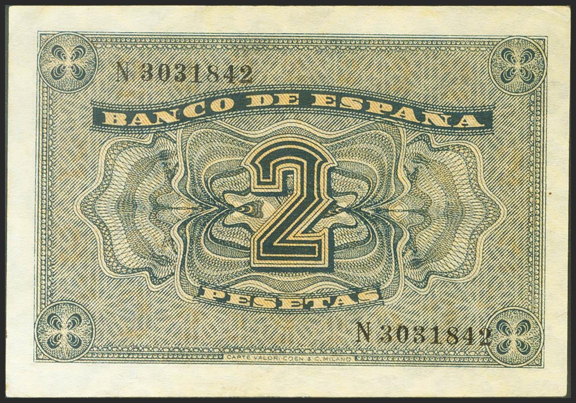 2 Pesetas. 30 de Abril de 1938. Serie N, última serie emitida. (Edifil 2021: 429a). Presenta parte del apresto original. EBC-.