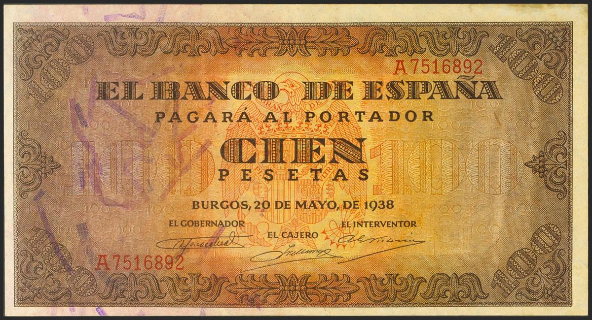 100 Pesetas. 20 de Mayo de 1938. Serie A. (Edifil 2021: 432). Conserva gran parte del apresto original. EBC+.