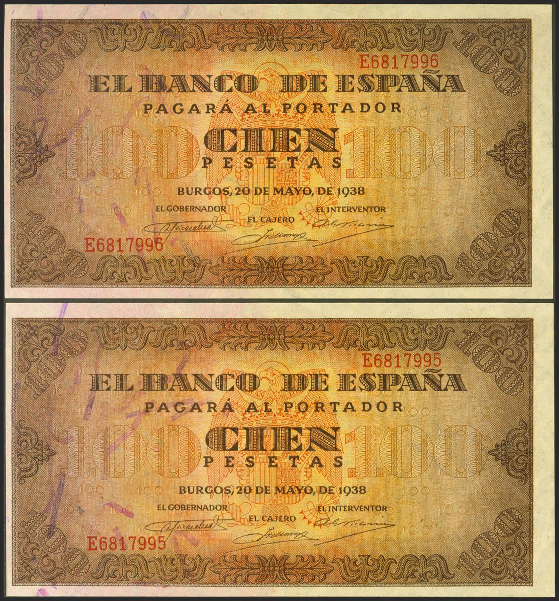 100 Pesetas. 20 de Mayo de 1938. Pareja correlativa. Serie E. (Edifil 2021: 432a). Conserva gran parte de su apresto original. EBC+.