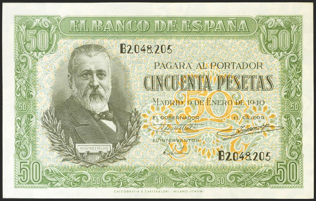 50 Pesetas. 9 de Enero de 1940. Serie B. (Edifil 2021: 437a). Apresto original. SC--.