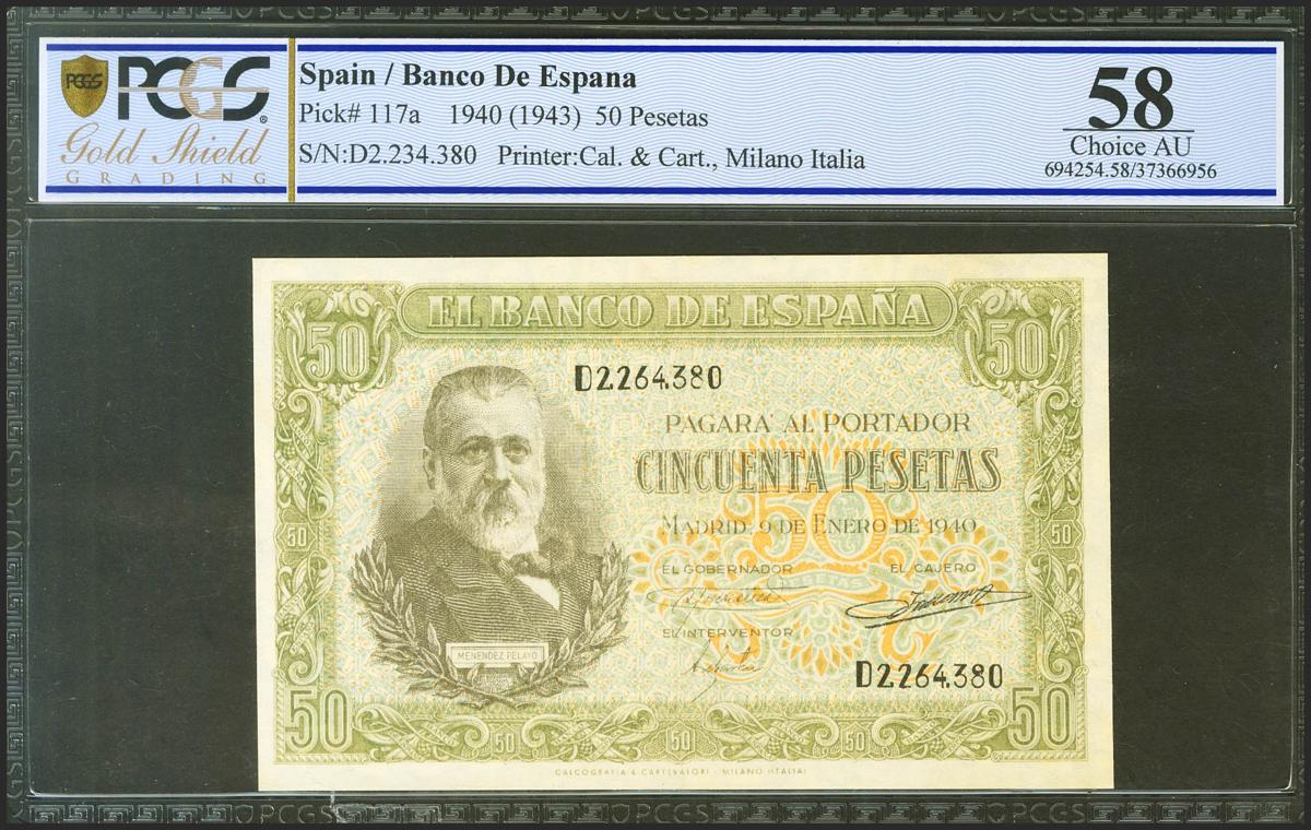 50 Pesetas. 9 de Enero de 1940. Serie D. (Edifil 2021: 437a, Pick: 117a). Inusual en esta calidad. EBC++. Encapsulado PMG58.