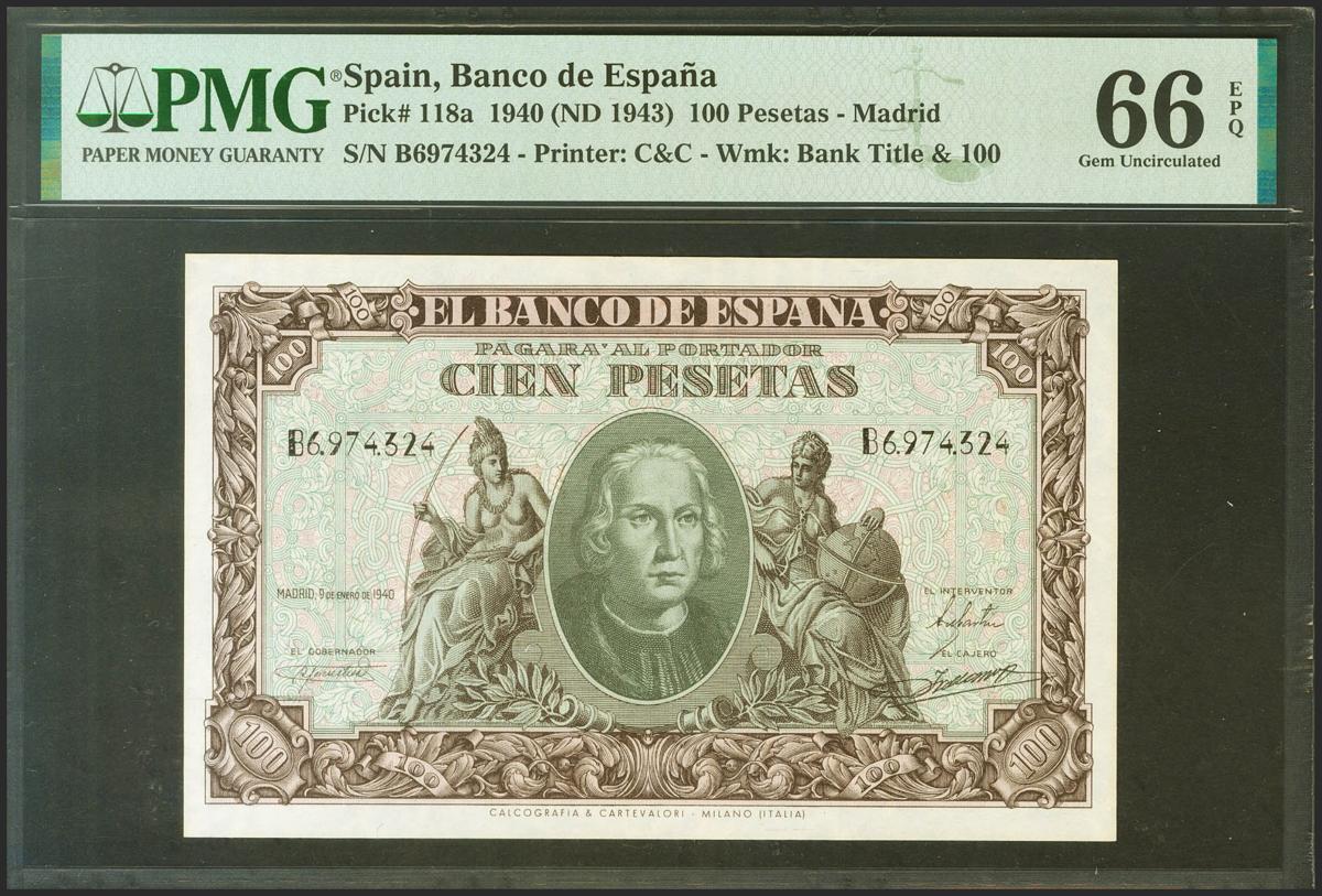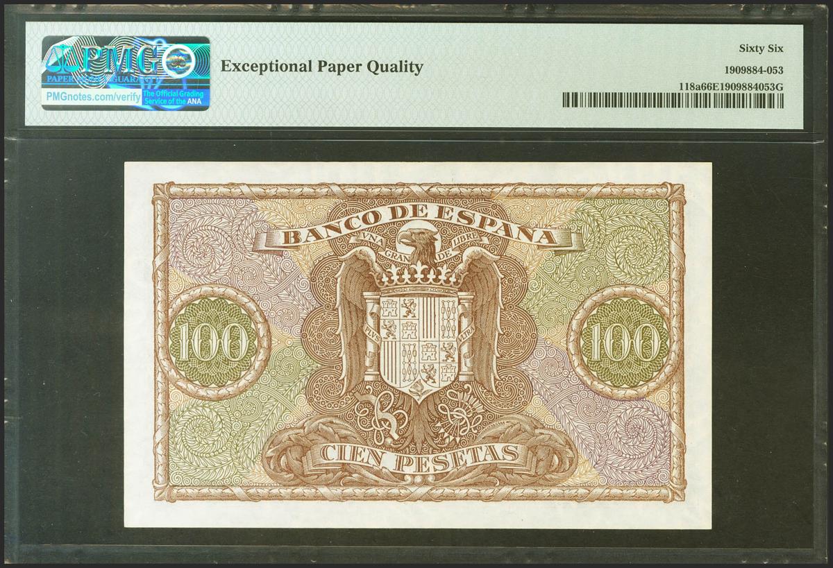 100 Pesetas. 9 de Enero de 1940. Serie B. (Edifil 2021: 438a, Pick: 118a). Inusual en esta excepcional calidad, apresto original. SC. Encapsulado PMG66EPQ.