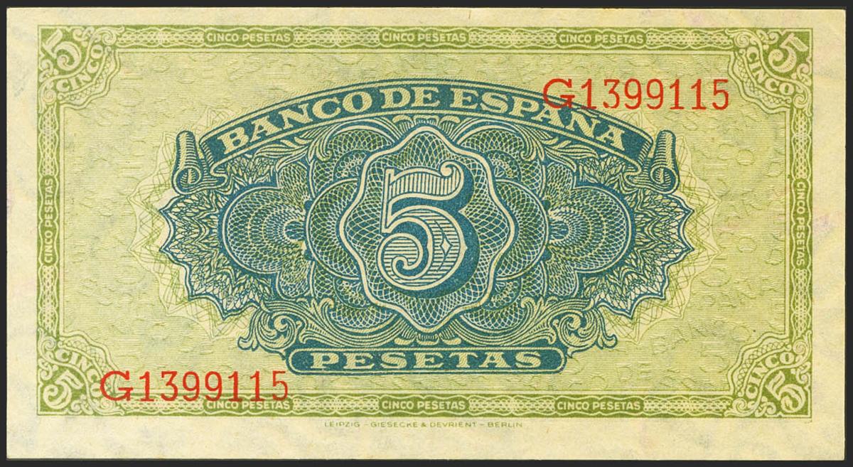 5 Pesetas. 4 de Septiembre de 1940. Serie G. (Edifil 2021: 443a). Conserva todo su apresto original. SC.