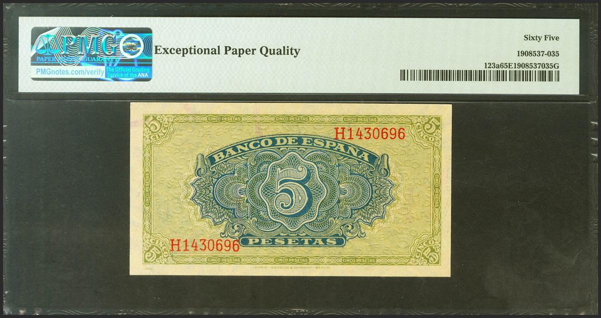 5 Pesetas. 4 de Septiembre de 1940. Serie H. (Edifil 2021: 443a, Pick: 123a). Inusual en esta excepcional calidad, apresto original. SC. Encapsulado PMG65EPQ.