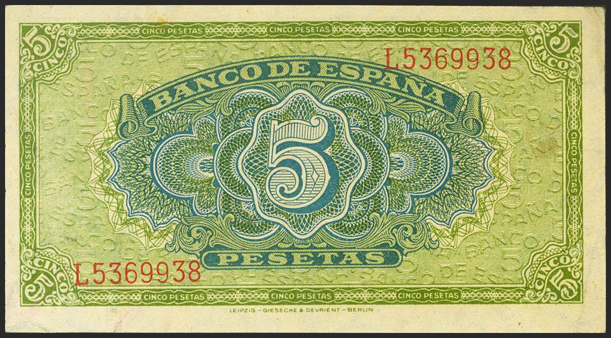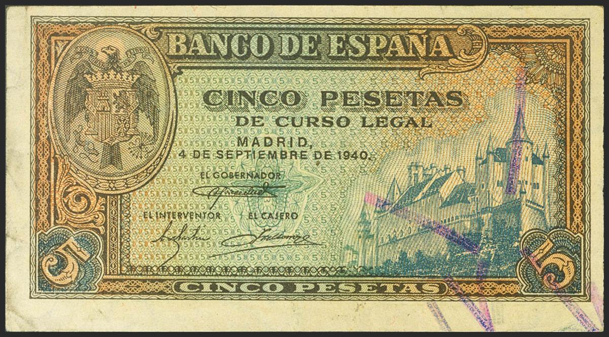 5 Pesetas. 4 de Septiembre de 1940. Serie L. (Edifil 2021: 443a). Conserva gran parte de su apresto original. EBC++.