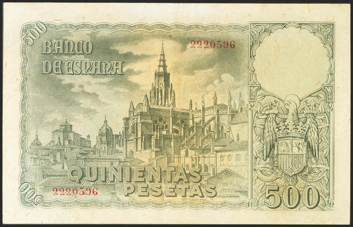 500 Pesetas. 21 de Octubre de 1940. Sin serie. (Edifil 2021: 444). Conserva parte del apresto original. EBC-.