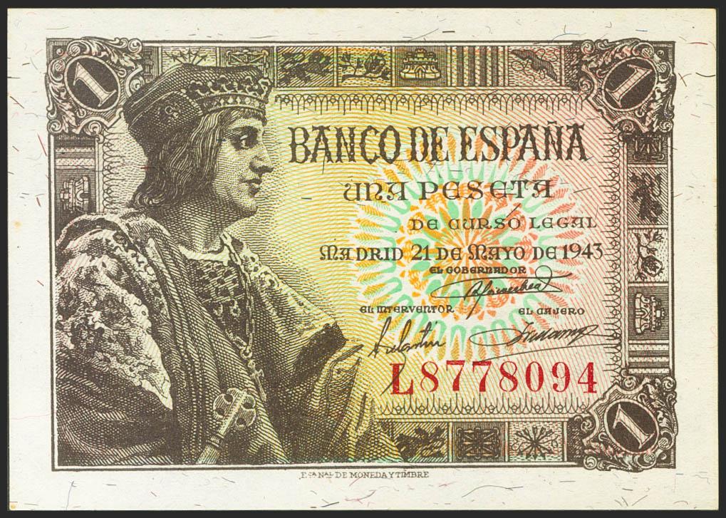 1 Peseta. 21 de Mayo de 1943. Serie L. (Edifil 2021: 447a). Apresto original. SC.
