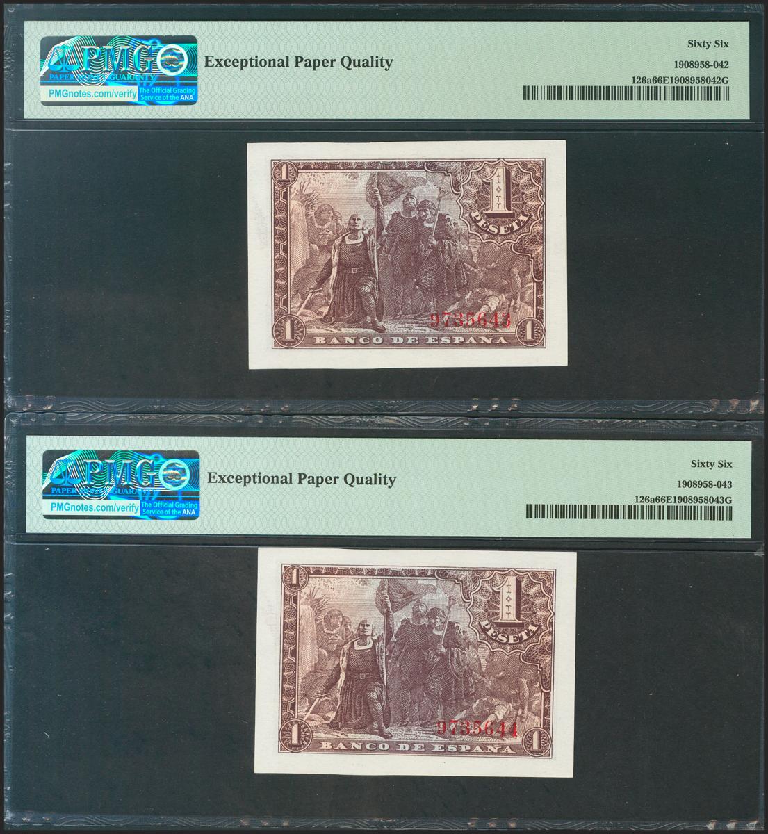 1 Pesetas. 21 de Mayo de 1943. Pareja correlativa. Sin serie. (Edifil 2021: 447, Pick: 126a). Rara en esta calidad, apresto original. SC. Encapsulado PMG66EPQ, ambos.