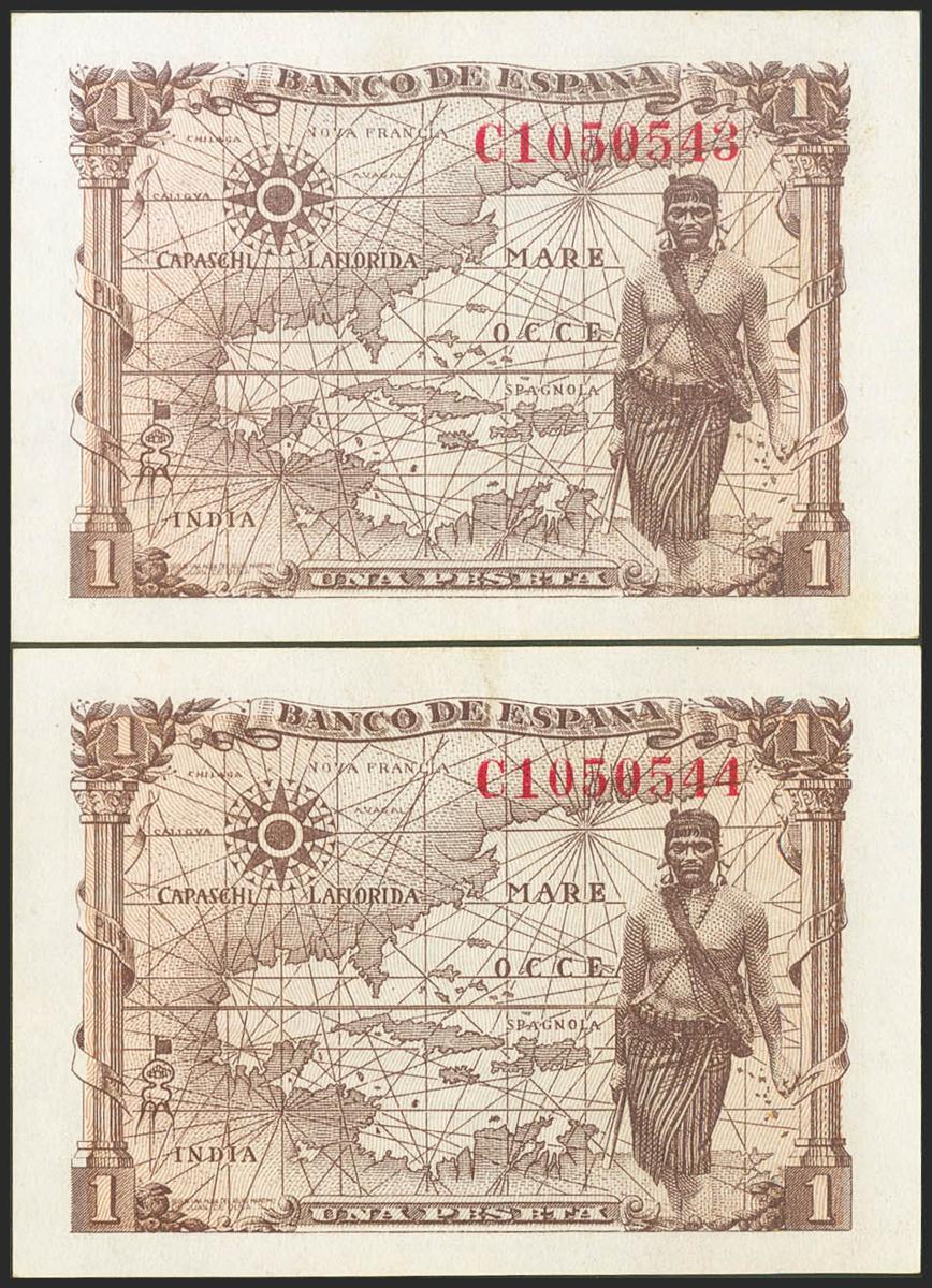 1 Peseta. 15 de Junio de 1945. Pareja correlativa. Serie C. (Edifil 2021: 448a). Conserva gran parte de su apresto original. EBC+.