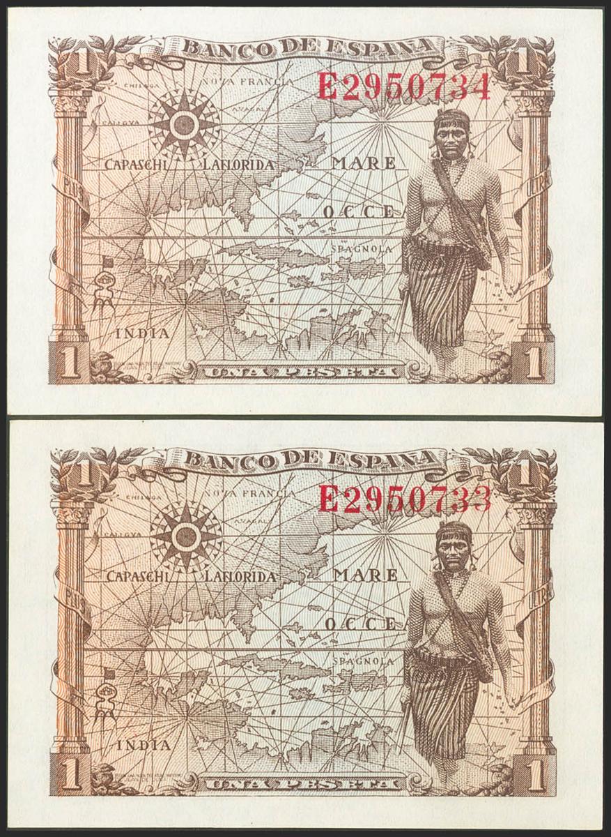 1 Peseta. 15 de Junio de 1945. Pareja correlativa. Serie E. (Edifil 2021: 448a). Apresto original. SC-.