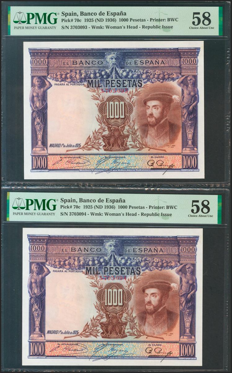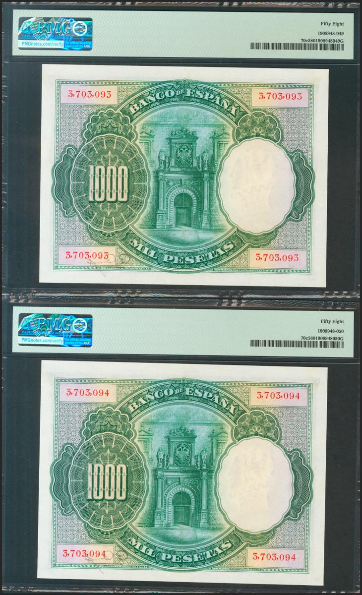 1000 Pesetas. 1 de Julio de 1925. Pareja correlativa. Sin serie y numeración posterior al 3646000. (Edifil 2021: 351, Pick: 70c). Inusual en esta calidad. EBC++. Encapsulado PMG58, ambos.