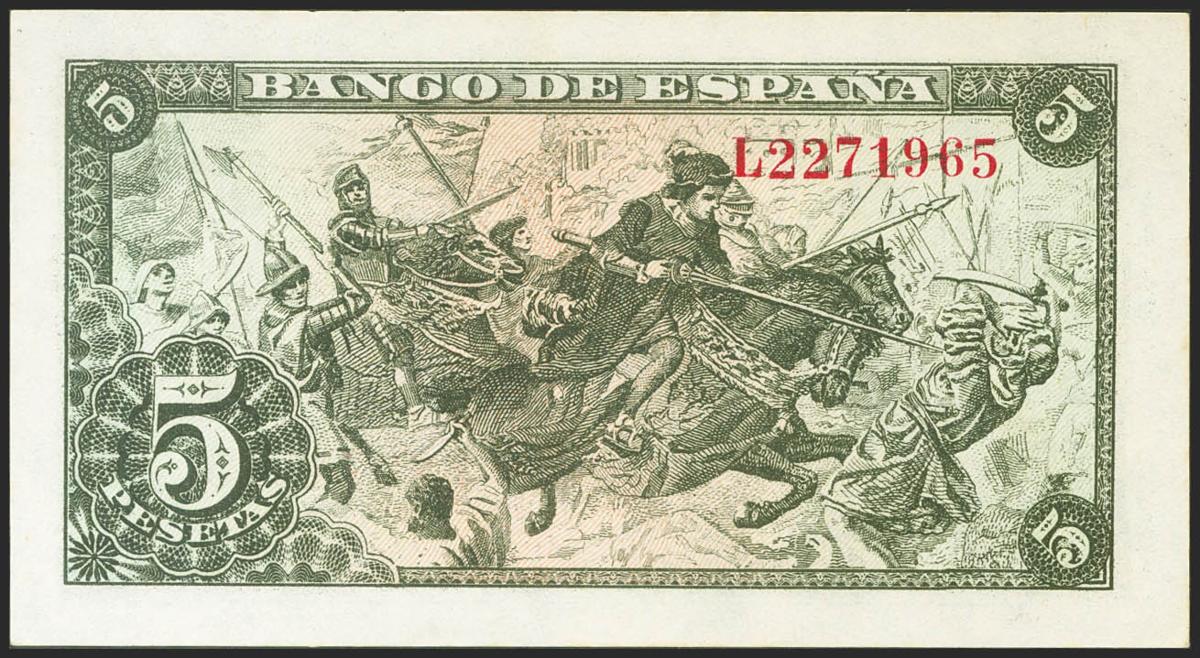 5 Pesetas. 15 de Junio de 1945. Serie L, última serie emitida. (Edifil 2021: 449a). Raro, apresto original. SC-.