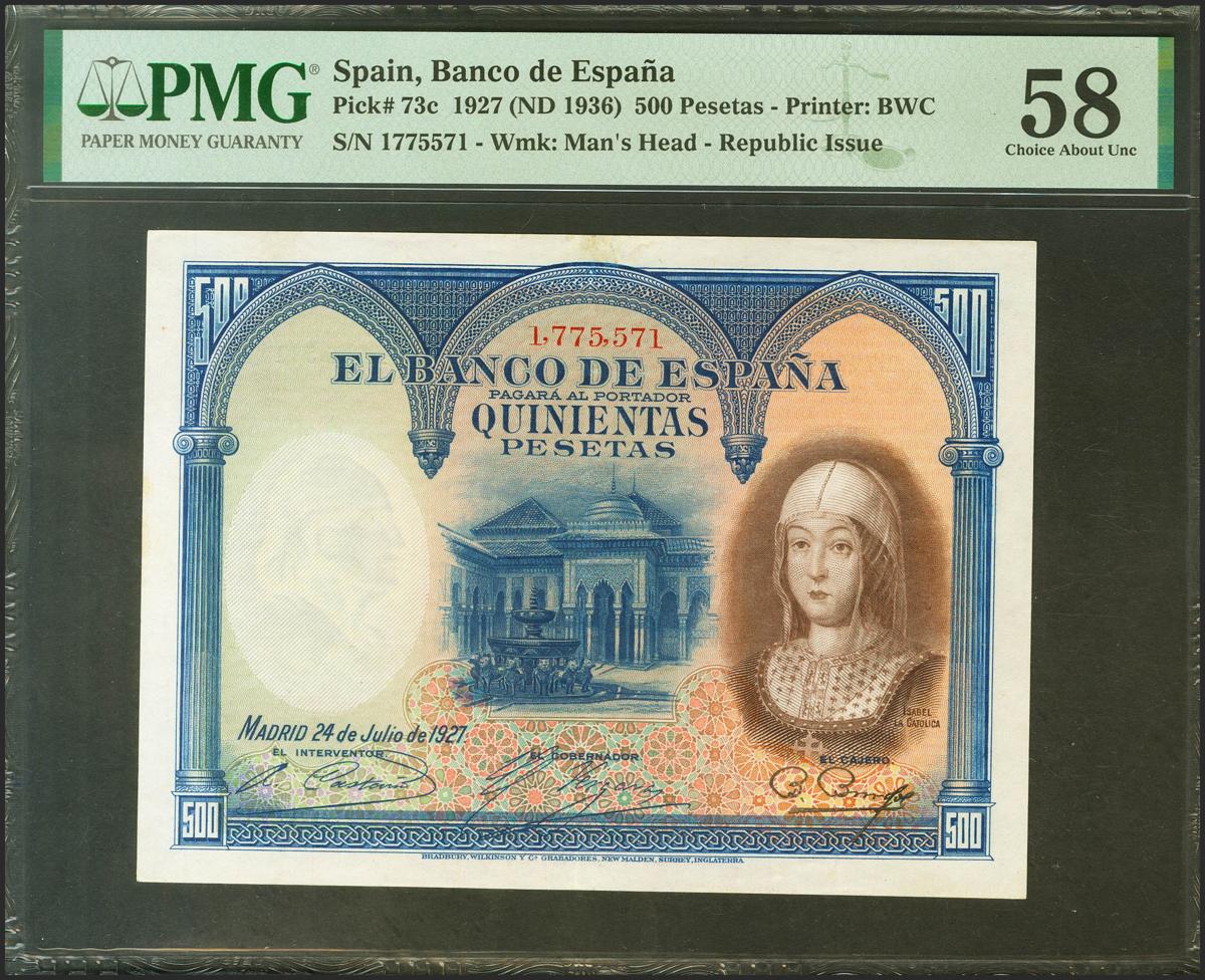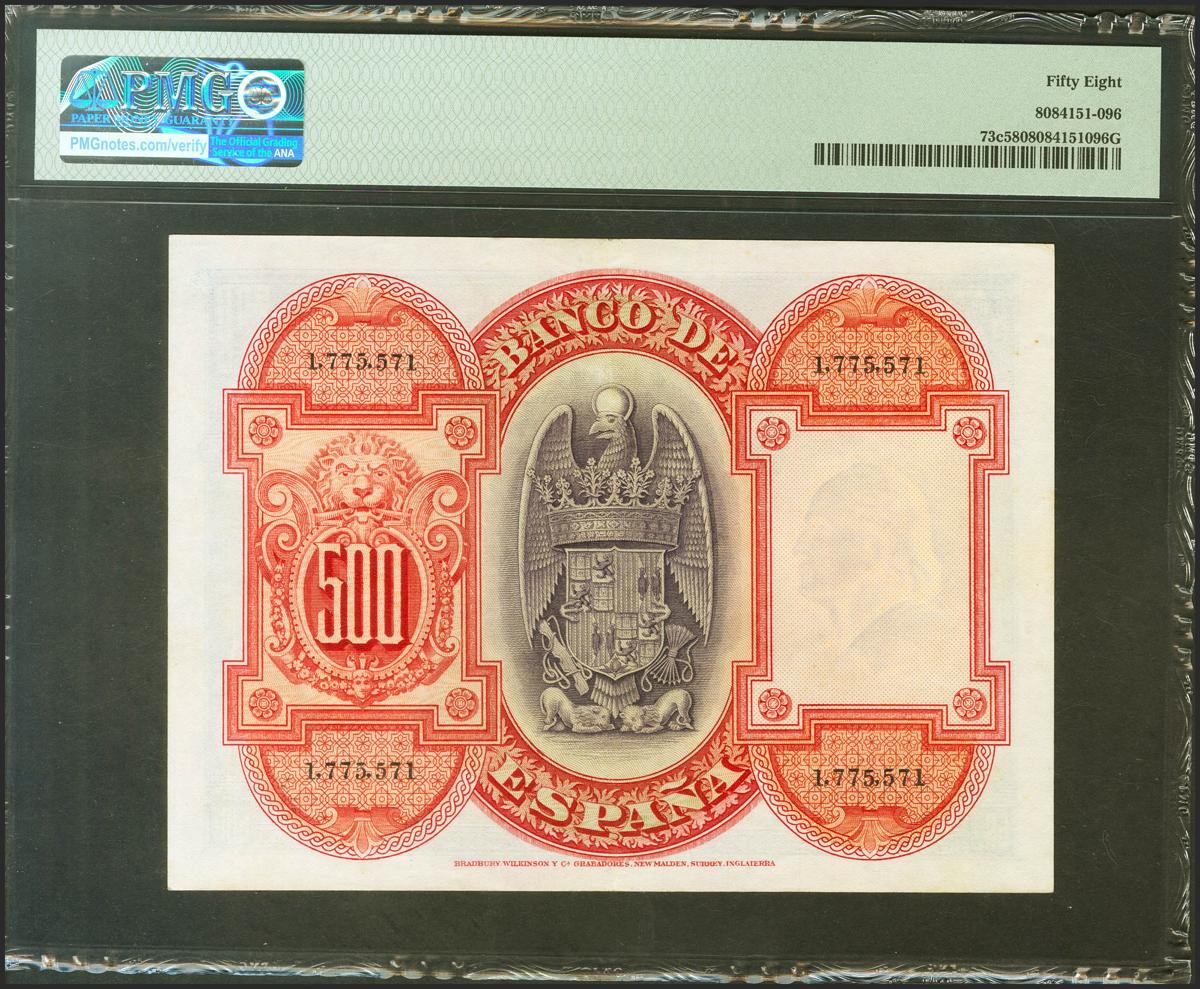 500 Pesetas. 24 de Julio de 1927. Sin serie y numeración posterior 1602000. (Edifil 2021: 352, Pick: 73c). EBC++. Encapsulado PMG58.