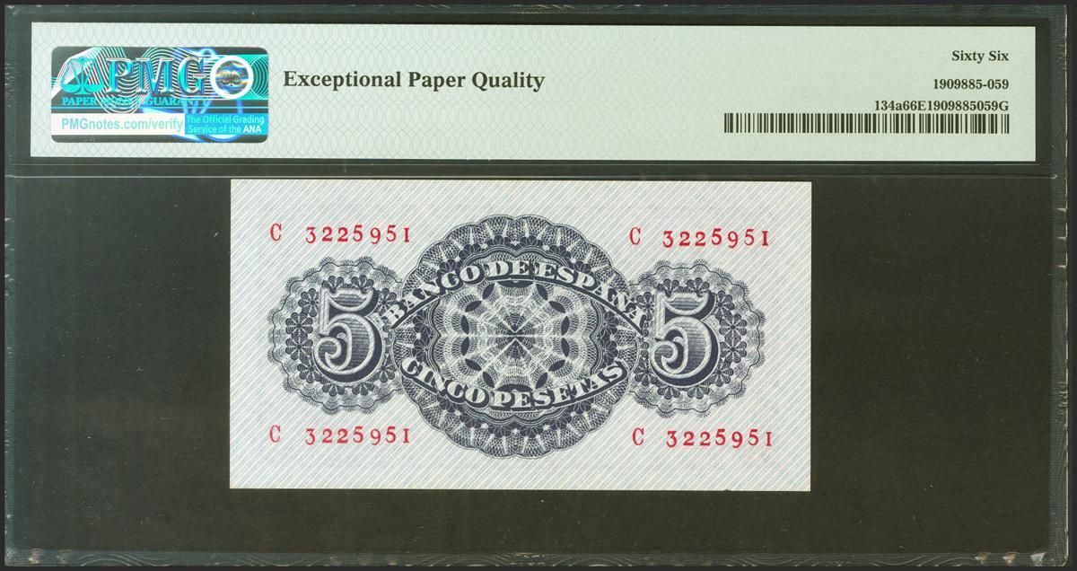 5 Pesetas. 12 de Abril de 1947. Serie C. (Edifil 2021: 454a, Pick: 134a). Raro en esta excepcional calidad, apresto original. SC. Encapsulado PMG66EPQ.