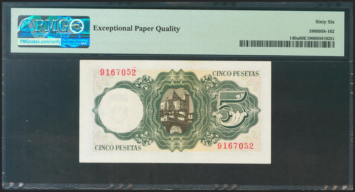 5 Pesetas. 16 de Agosto de 1951. Sin serie. (Edifil 2021: 459, Pick: 140a). Raro en esta calidad, apresto original. SC. Encapsulado PMG66EPQ.