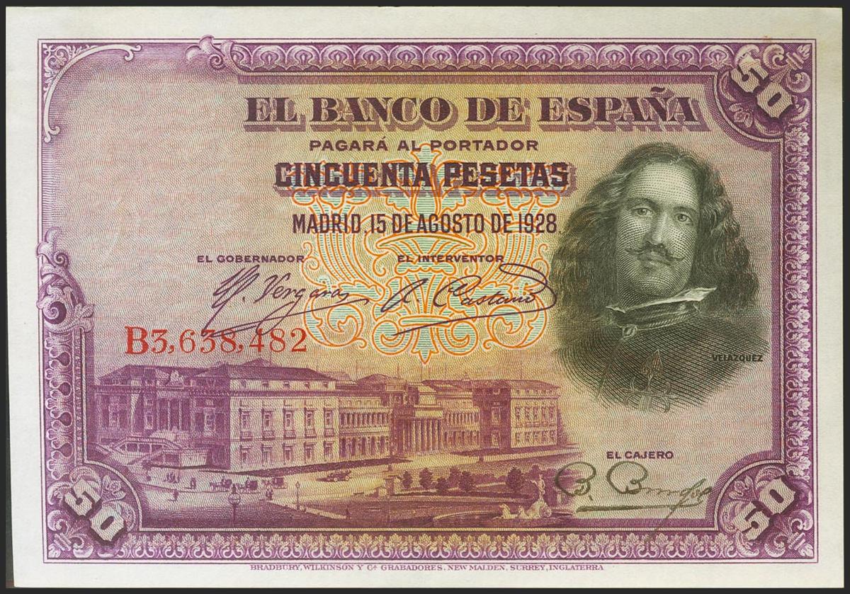 50 Pesetas. 15 de Agosto de 1928. Serie B. (Edifil 2021: 354). Apresto original, inusual serie. SC.