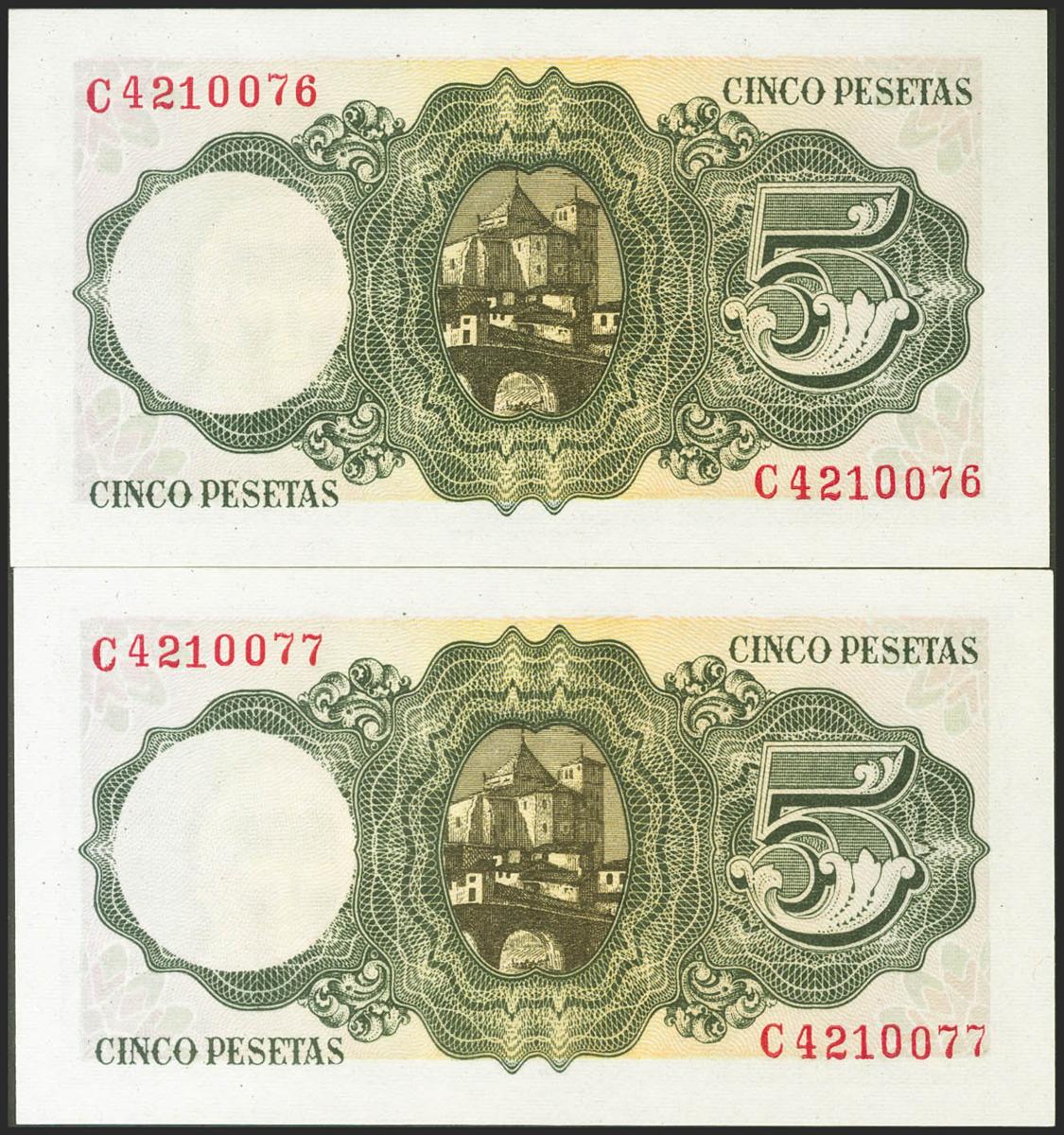 5 Pesetas. 16 de Agosto de 1951. Pareja correlativa. Serie C. (Edifil 2021: 459a). Apresto original. SC.
