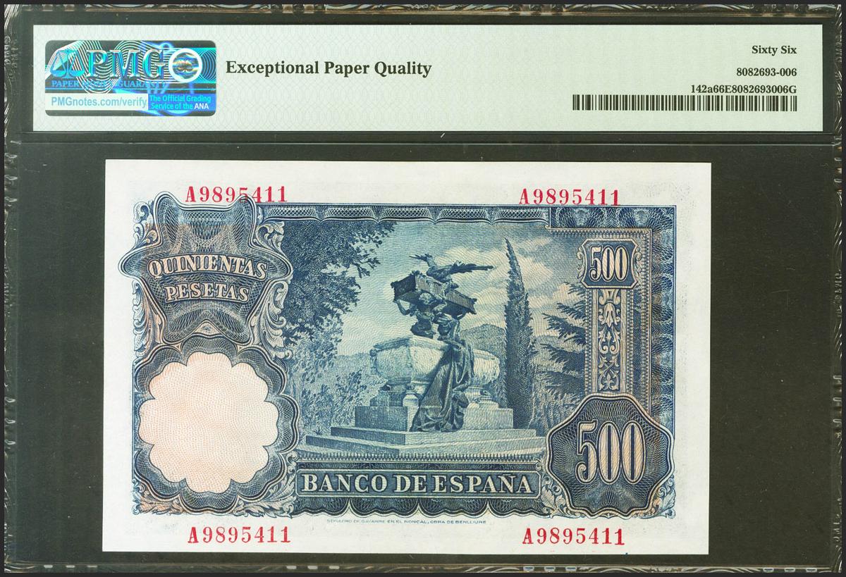 500 Pesetas. 15 de Noviembre de 1951. Serie A. (Edifil 2021: 460, Pick: 142a). Inusual en esta excepcional calidad, apresto original. SC. Encapsulado PMG66EPQ.