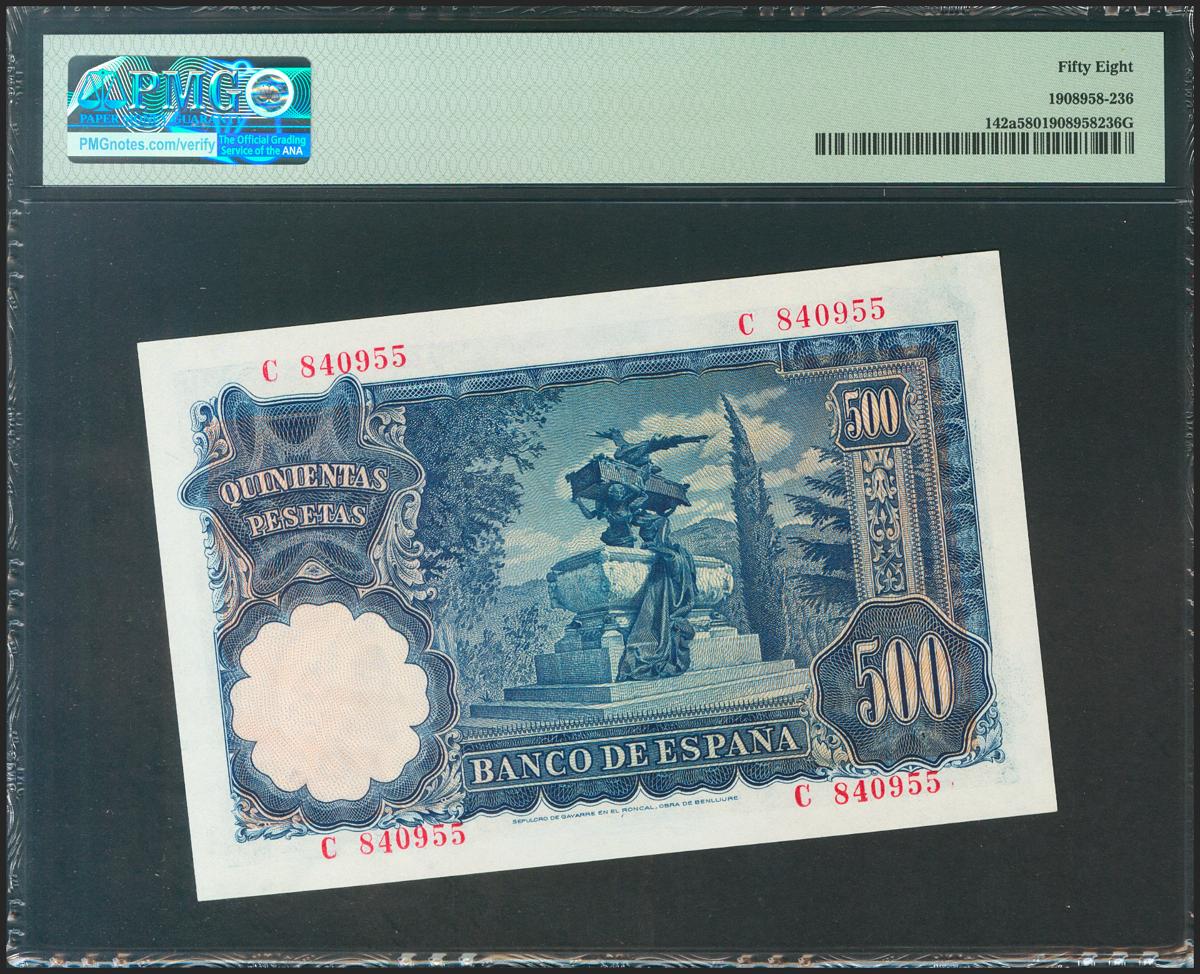 500 Pesetas. 15 de Noviembre de 1951. Serie C, última serie emitida. (Edifil 2021: 460a, Pick: 142a). Inusual en esta calidad. EBC++. Encapsulado PMG58.