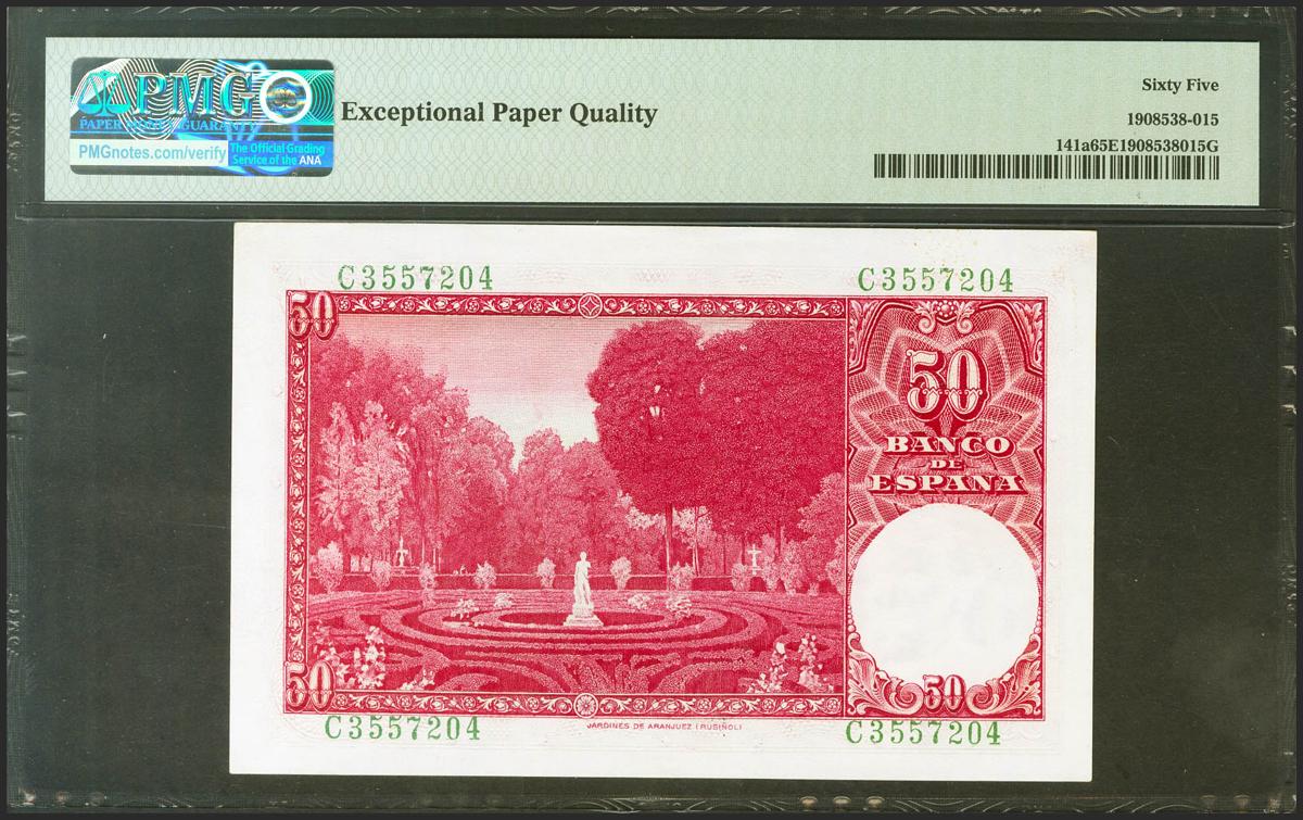 50 Pesetas. 31 de Diciembre de 1951. Serie C. (Edifil 2021: 462b, Pick: 141a). Inusual en esta excepcional calidad, apresto original. SC. Encapsulado PMG65EPQ.