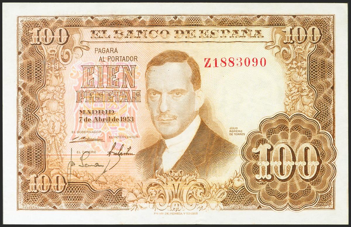 100 Pesetas. 7 de Abril de 1953. Serie Z. (Edifil 2021: 464b). Apresto original. SC-.