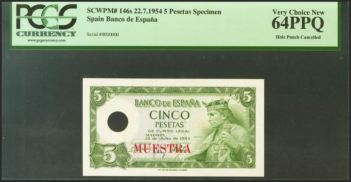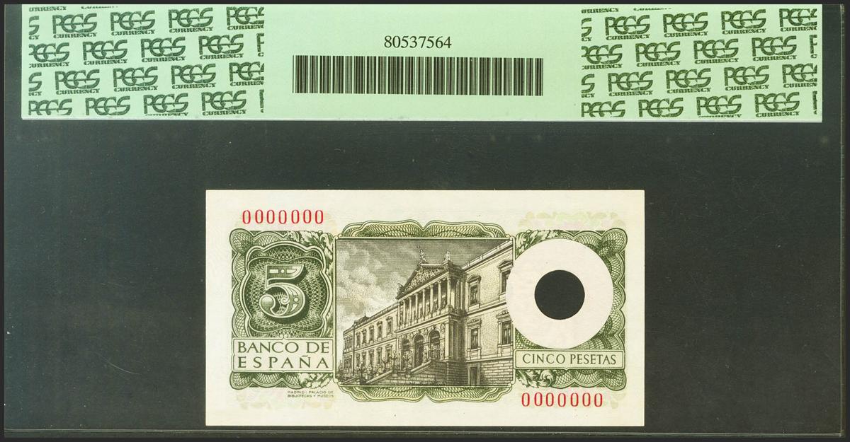 5 Pesetas. 22 de Julio de 1954. Numeración 0000000, taladro en el lugar habilitado para la marca de agua y MUESTRA. (Edifil 2021: 466Ma, Pick: 146s). Muy raro, apresto original. SC. Encapsulado PMG64PPQ.