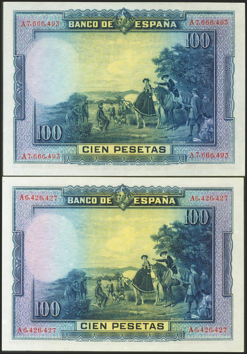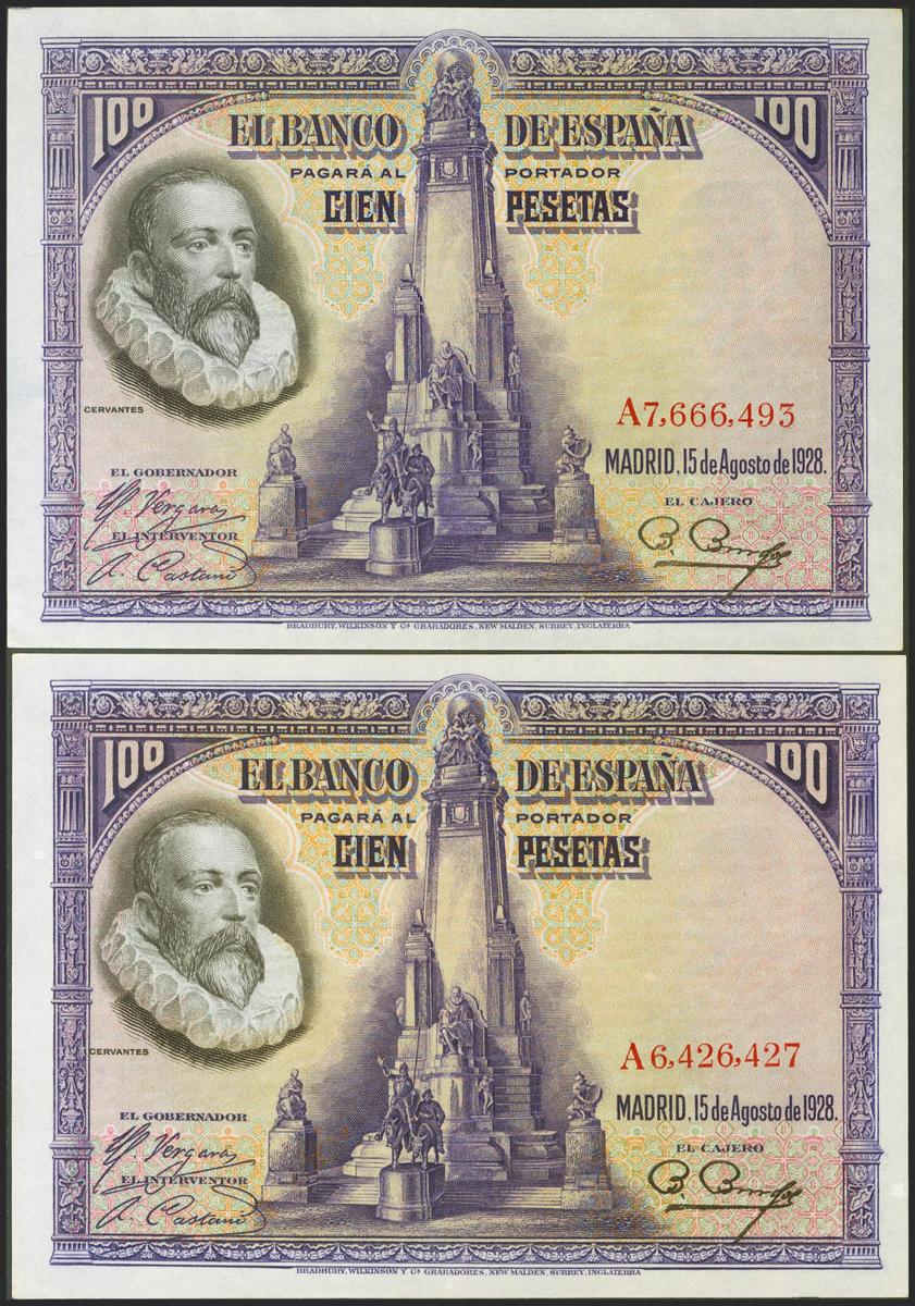 Conjunto de 2 billetes de 100 Pesetas emitidos el 15 de Agosto de 1928, ambos de la serie A. (Edifil 2021: 355a), conservando su apresto original. SC.