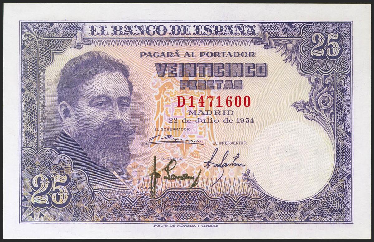 25 Pesetas. 22 de Julio de 1954. Serie D. (Edifil 2021: 467a). Conserva gran parte de su apresto original. EBC+.