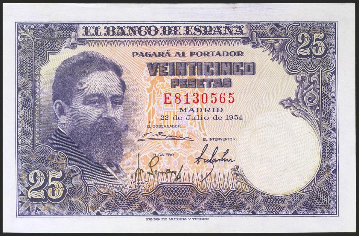 25 Pesetas. 22 de Julio de 1954. Serie E. (Edifil 2021: 467a). Conserva gran parte de su apresto original. EBC+.