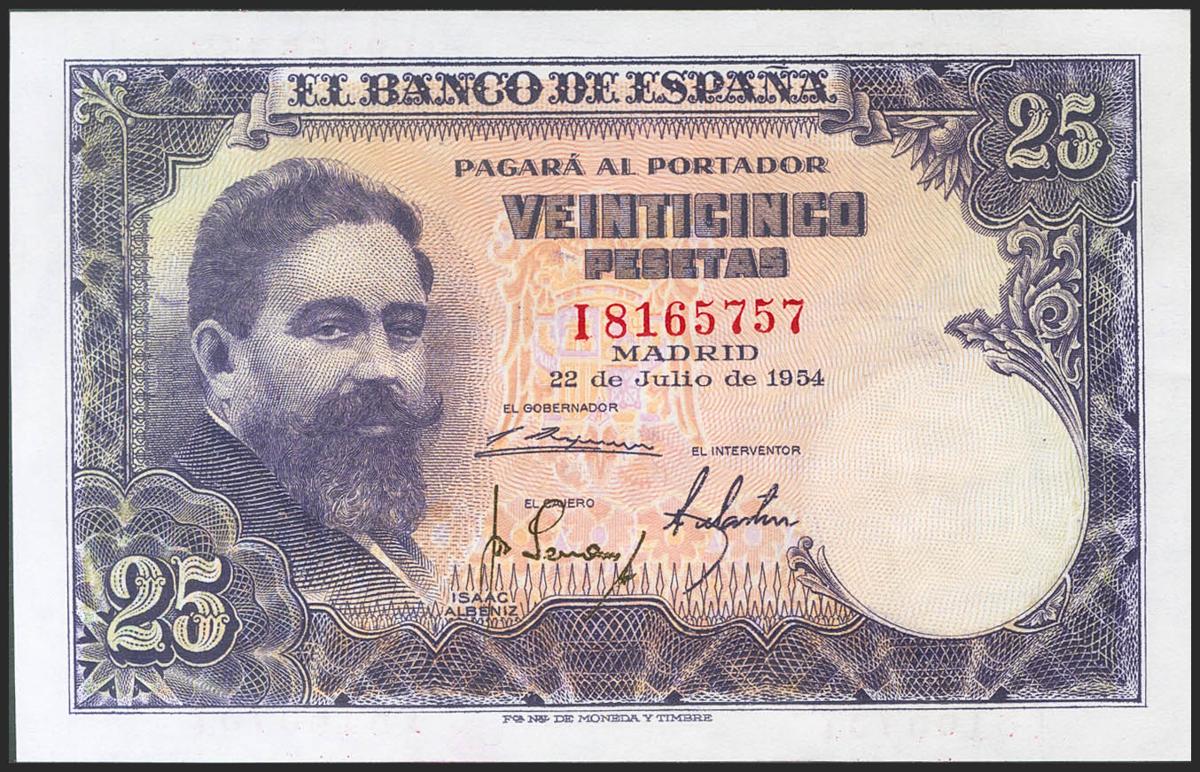 25 Pesetas. 22 de Julio de 1954. Serie I. (Edifil 2021: 467a). Apresto original. SC-.