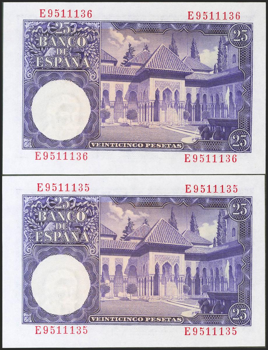 25 Pesetas. 22 de Julio de 1954. Pareja correlativa. Serie E. (Edifil 2021: 467a). Apresto original. SC.