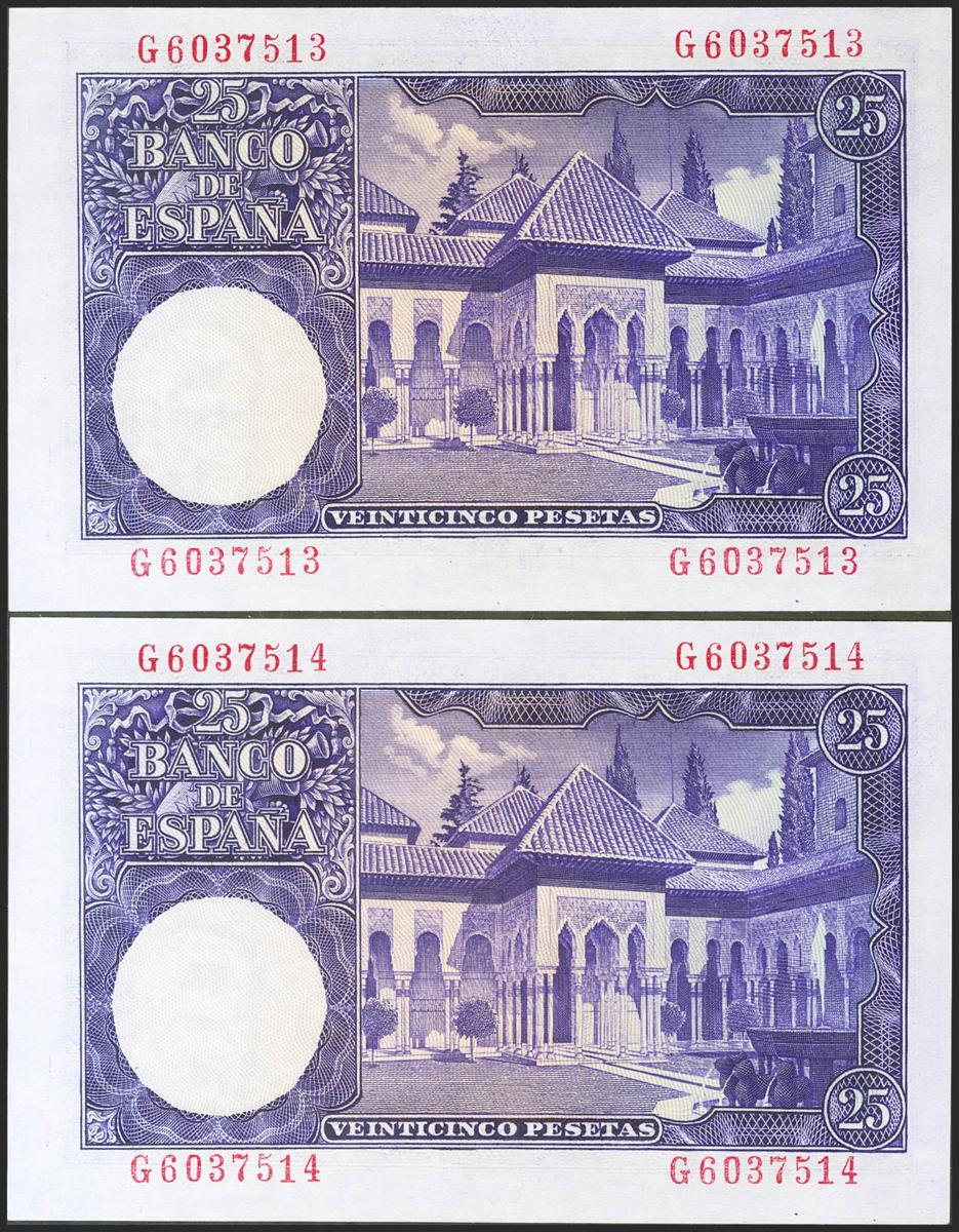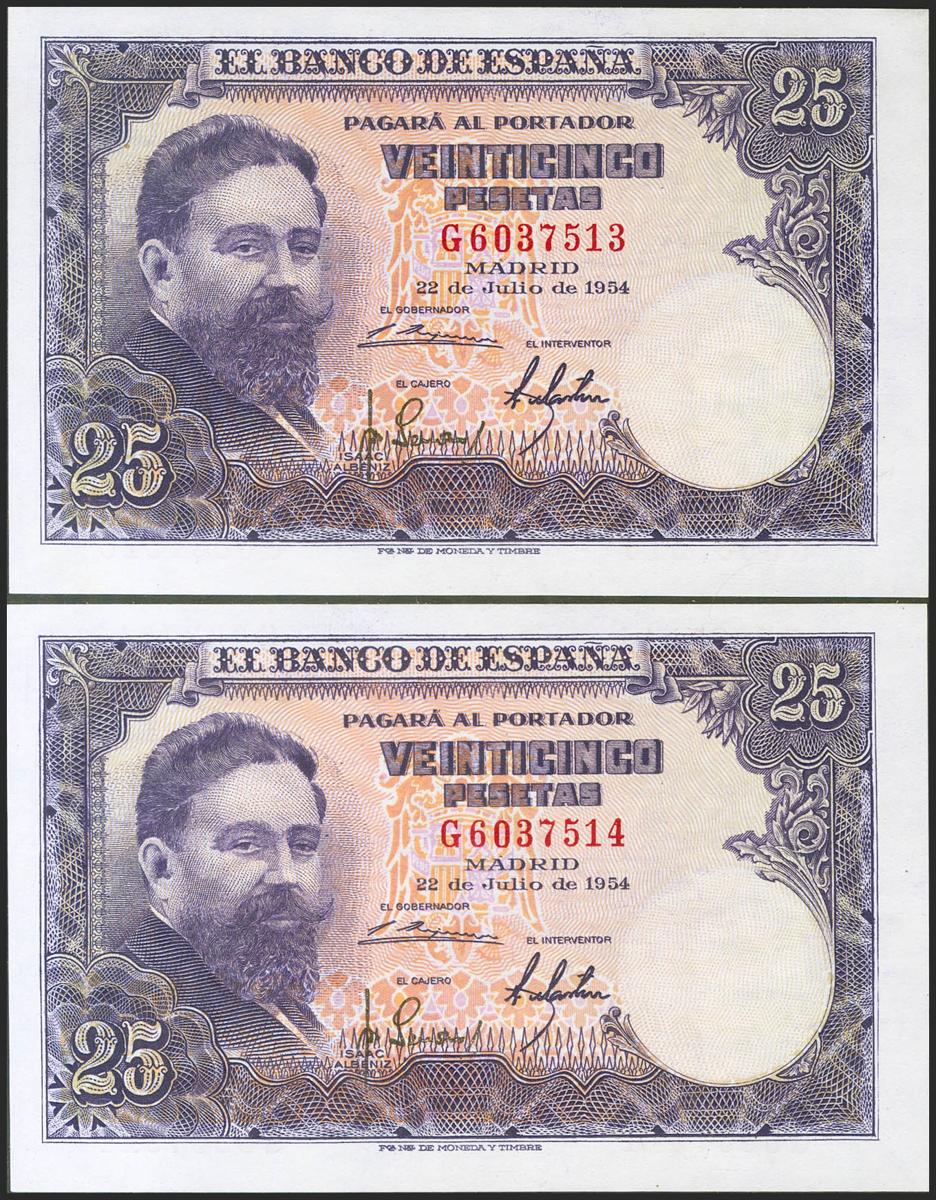 25 Pesetas. 22 de Julio de 1954. Pareja correlativa. Serie G. (Edifil 2021: 467a). Apresto original. SC.