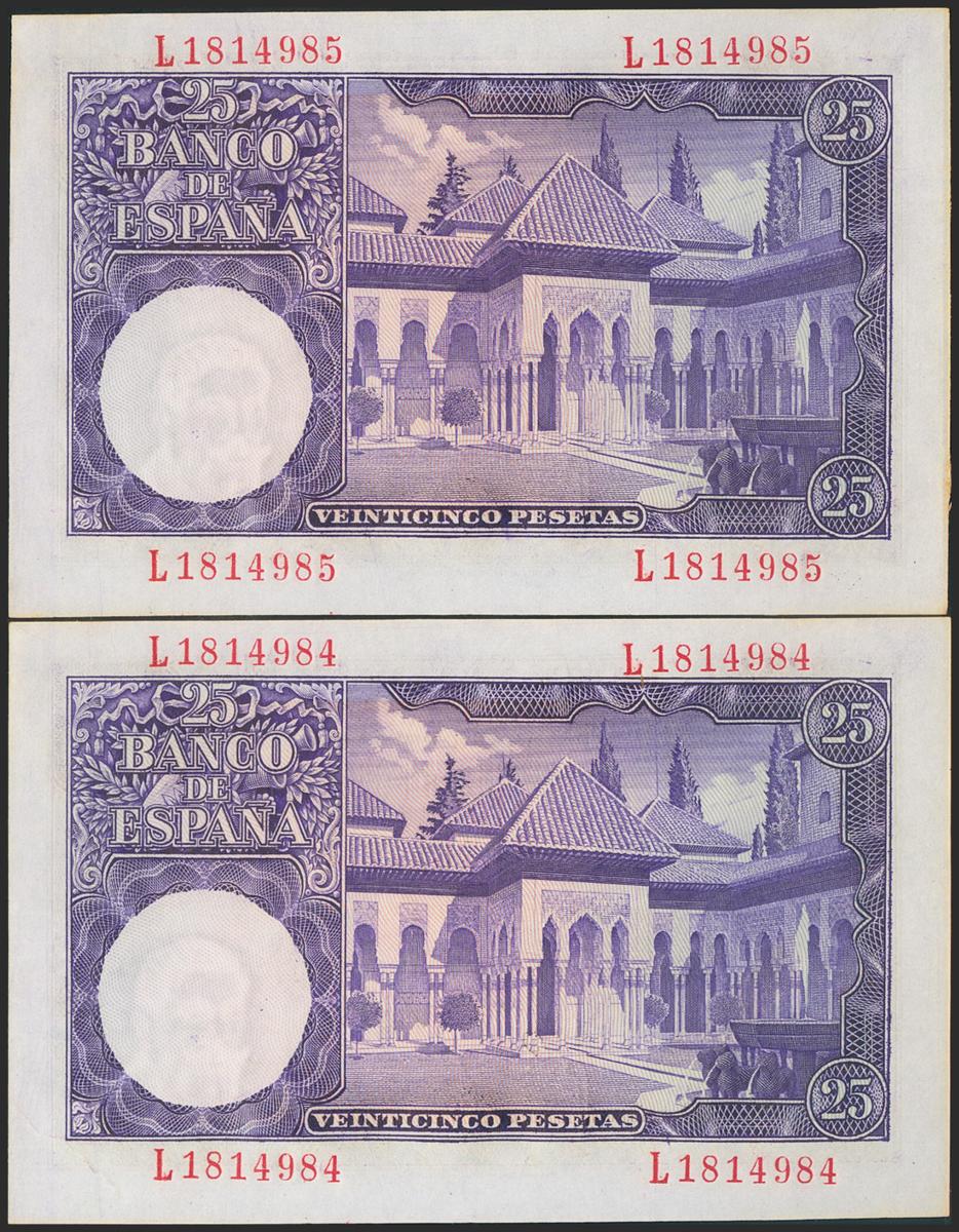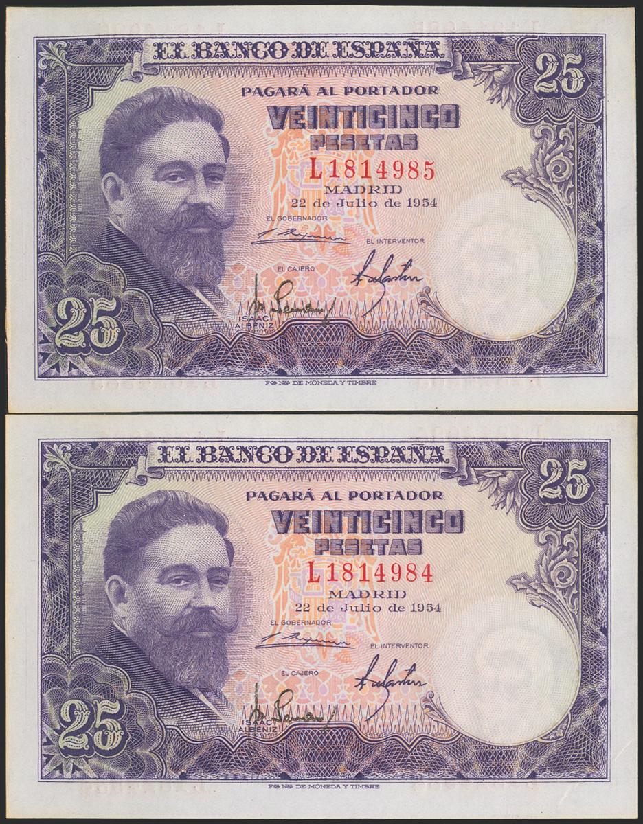 25 Pesetas. 22 de Julio de 1954. Pareja correlativa. Serie L. (Edifil 2021: 467a). Apresto original, sombritas. EBC++.