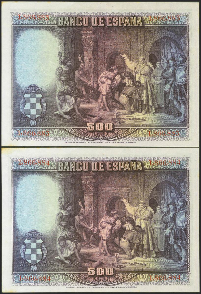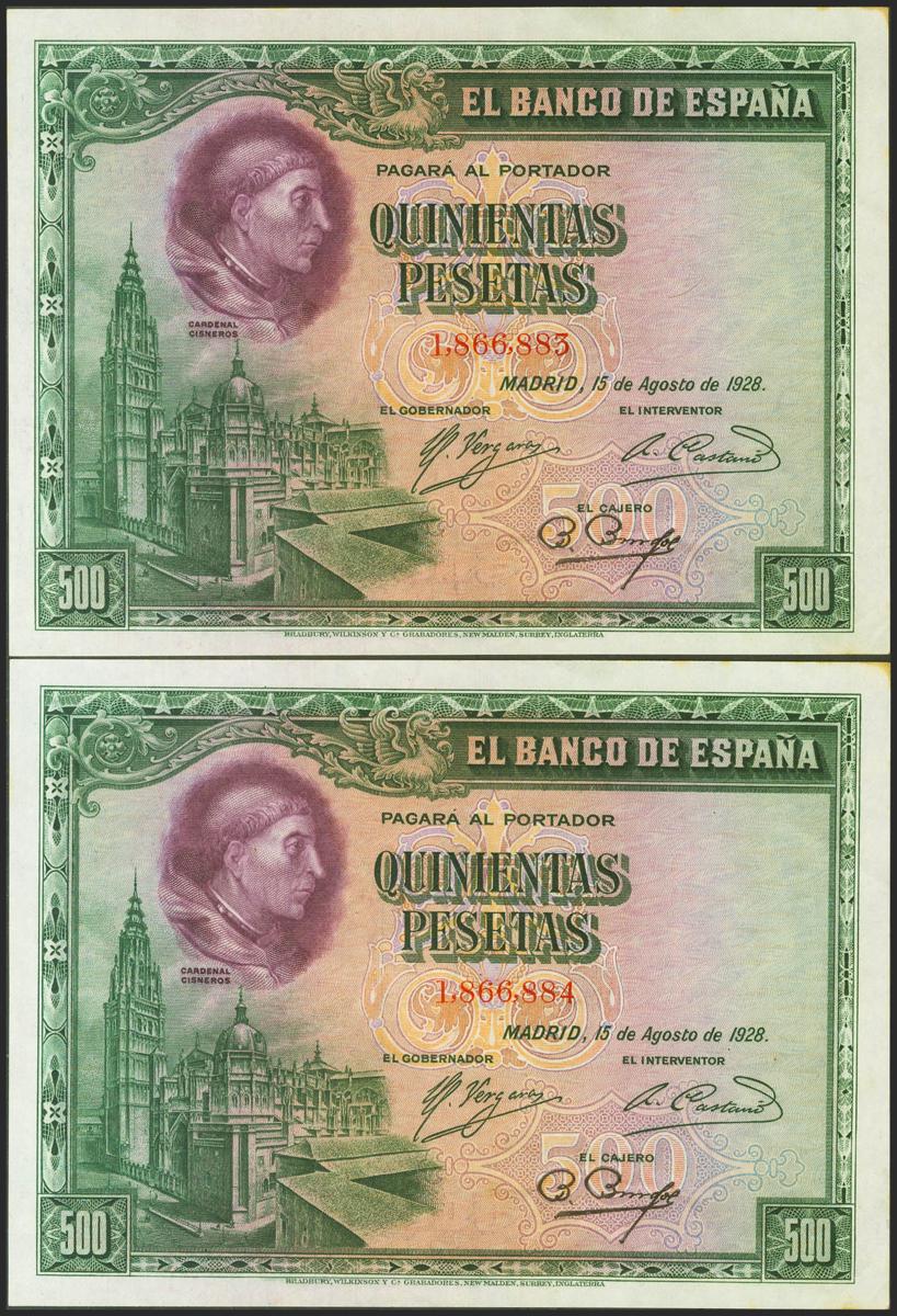500 Pesetas. 15 de Agosto de 1928. Pareja correlativa. Sin serie. (Edifil 2021: 356). Manchitas en la esquina superior derecha, apresto original. SC--.