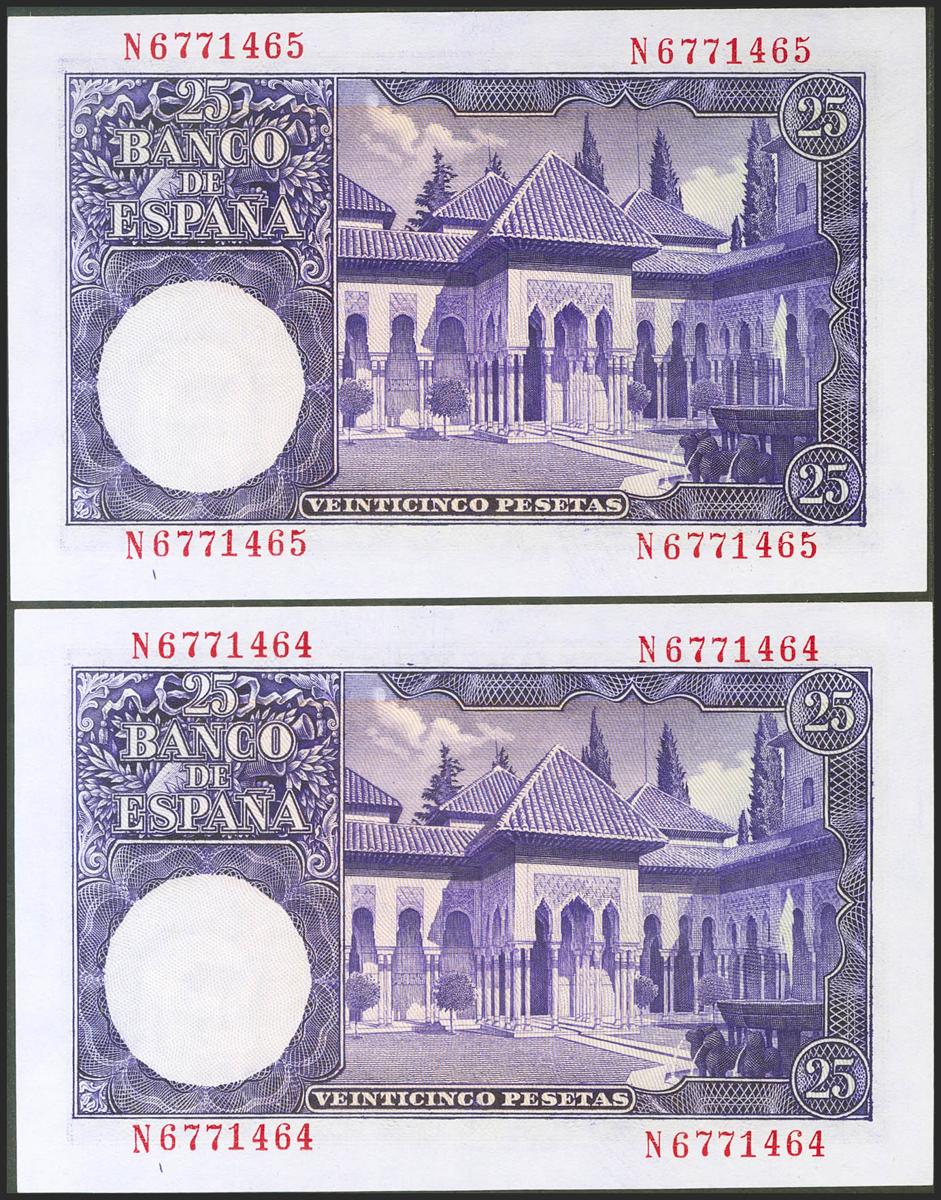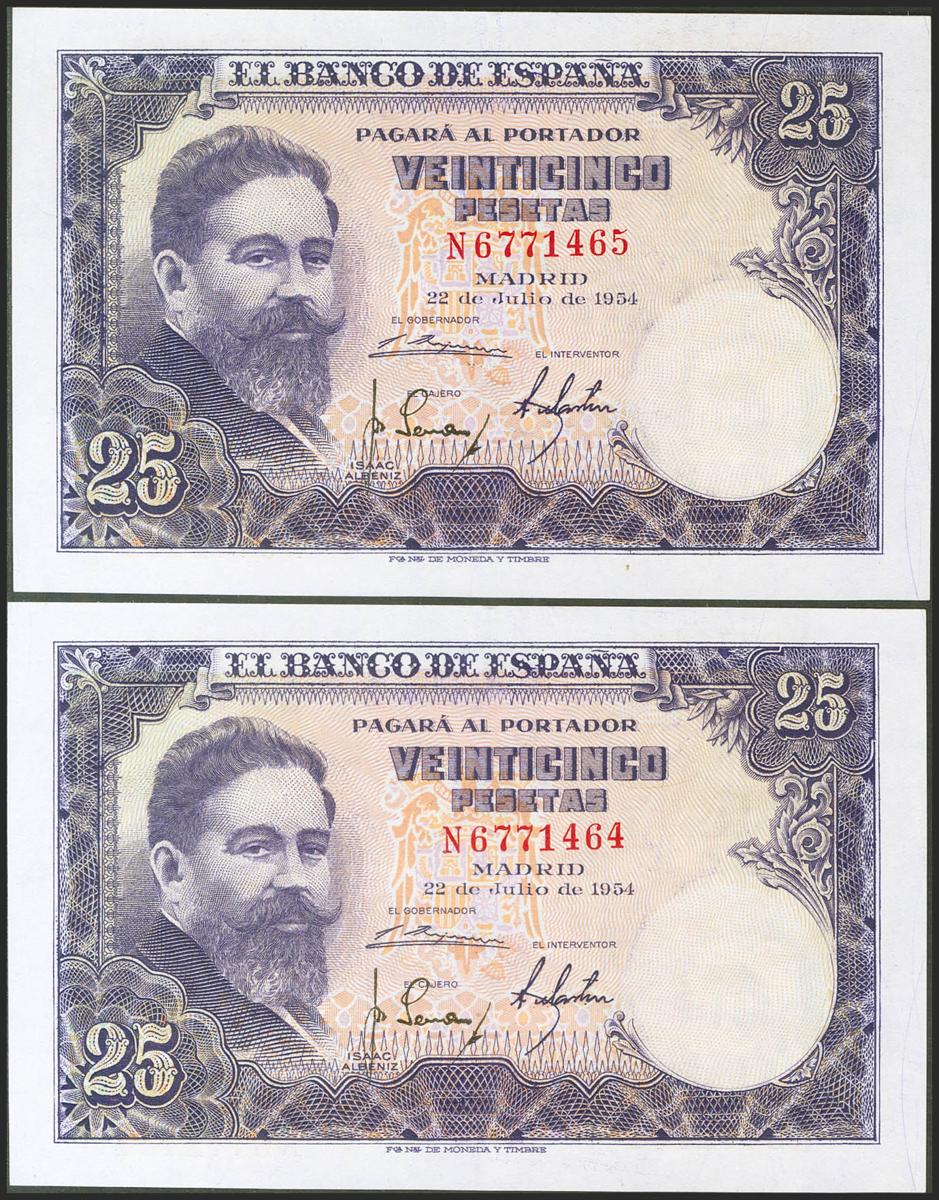 25 Pesetas. 22 de Julio de 1954. Pareja correlativa. Serie N. (Edifil 2021: 467a). Conserva gran parte de su apresto original. EBC++.
