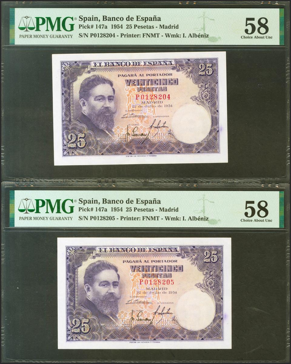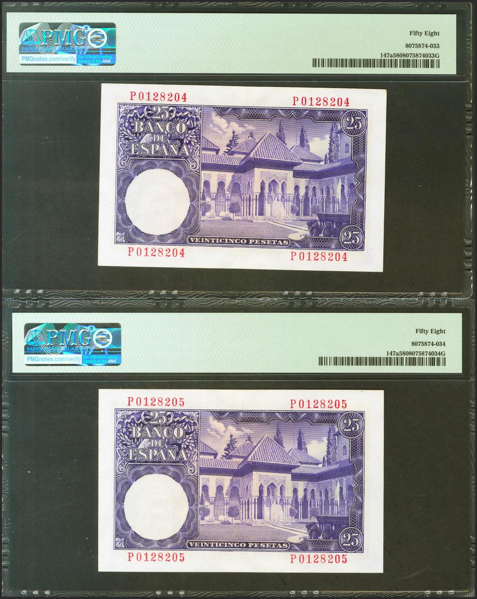 25 Pesetas. 22 de Julio de 1954. Pareja correlativa. Serie P. (Edifil 2021: 467b, Pick: 147a). Muy rara serie especialmente en pareja. EBC++. Encapsulados PMG58, ambos.