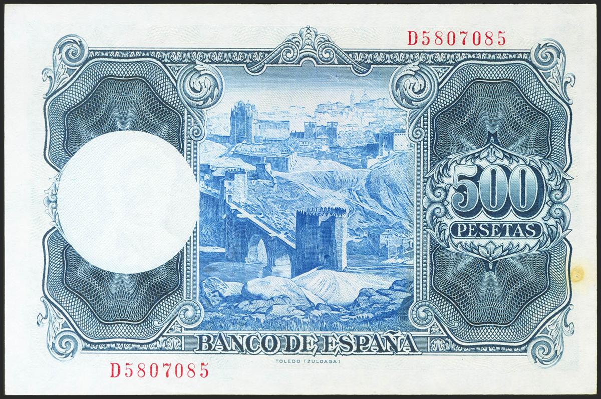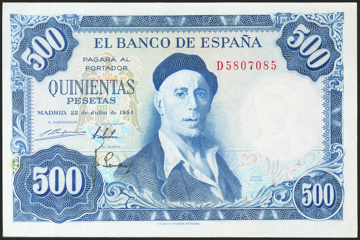 500 Pesetas. 22 de Julio de 1954. Serie D. (Edifil 2021: 468b). Apresto original, puntito del tiempo que coincide con el puntito de una grapa. EBC+.