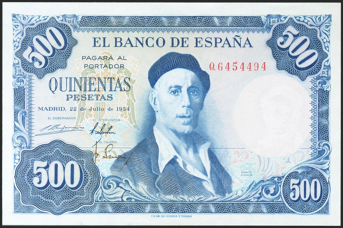 500 Pesetas. 22 de Julio de 1954. Serie Q. (Edifil 2021: 468b). Conserva todo su apresto original. SC-.