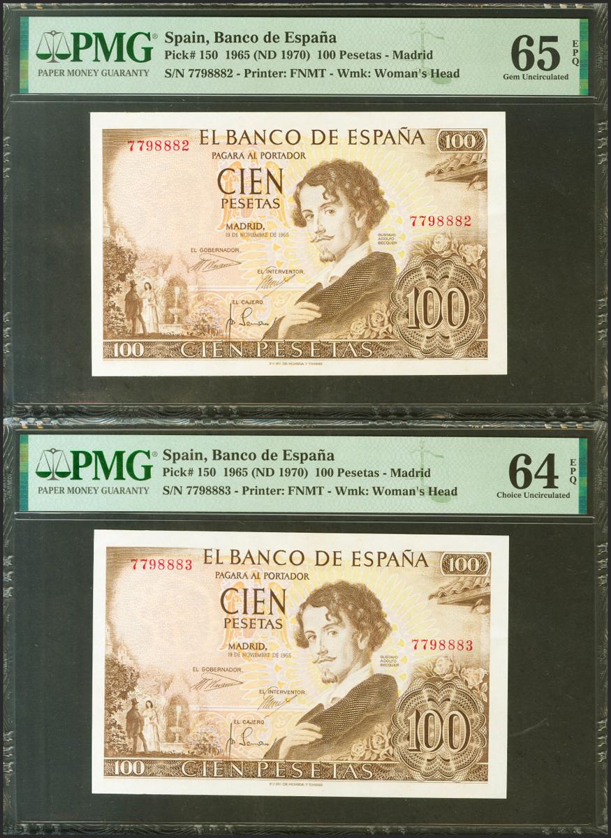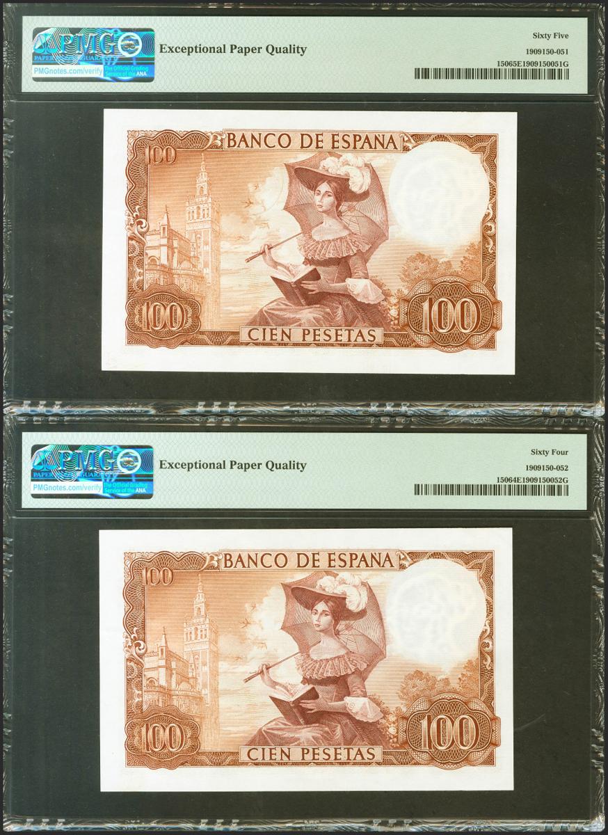 100 Pesetas. 19 de Noviembre de 1965. Pareja correlativa. Sin serie. (Edifil 2021: 470, Pick: 150). Apresto original. Encapsulados PMG65EPQ/64EPQ.