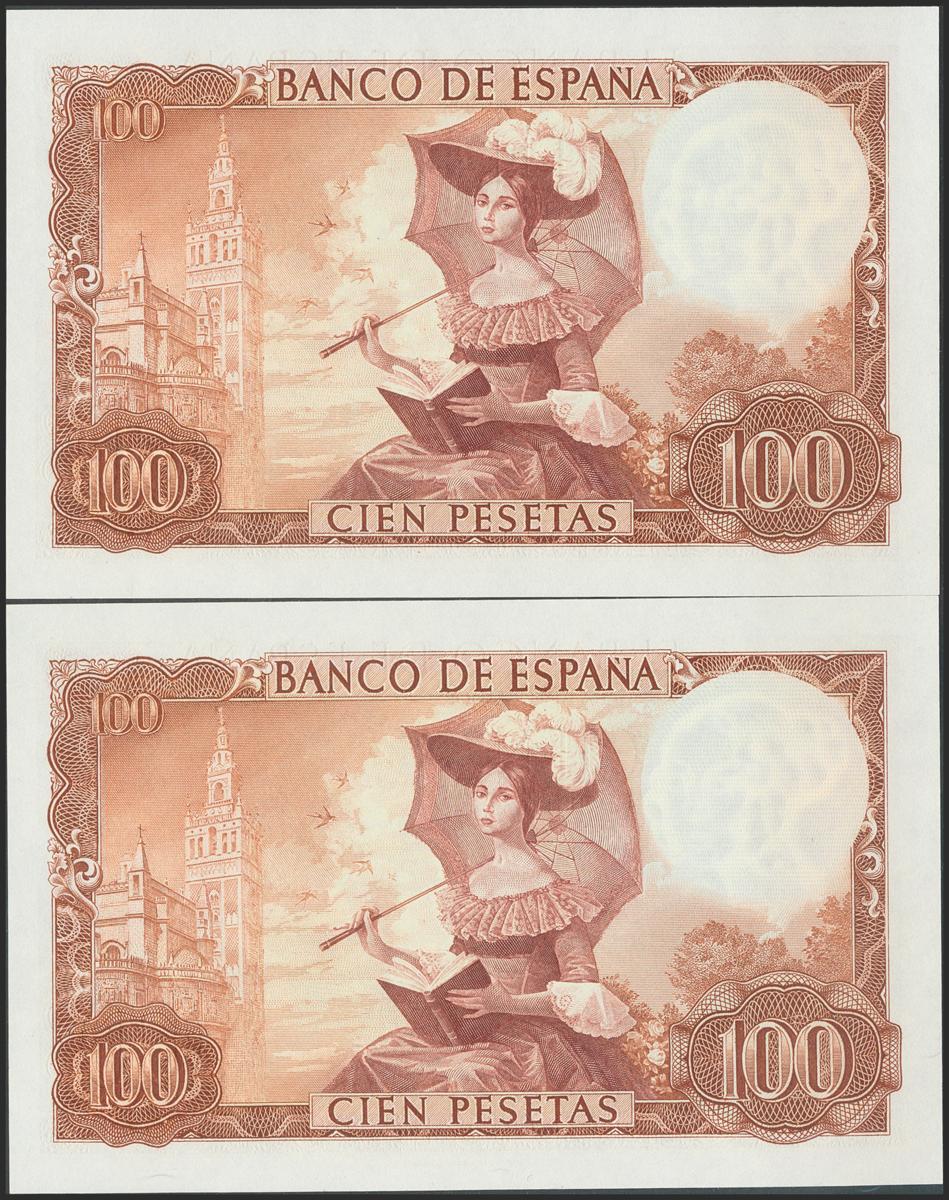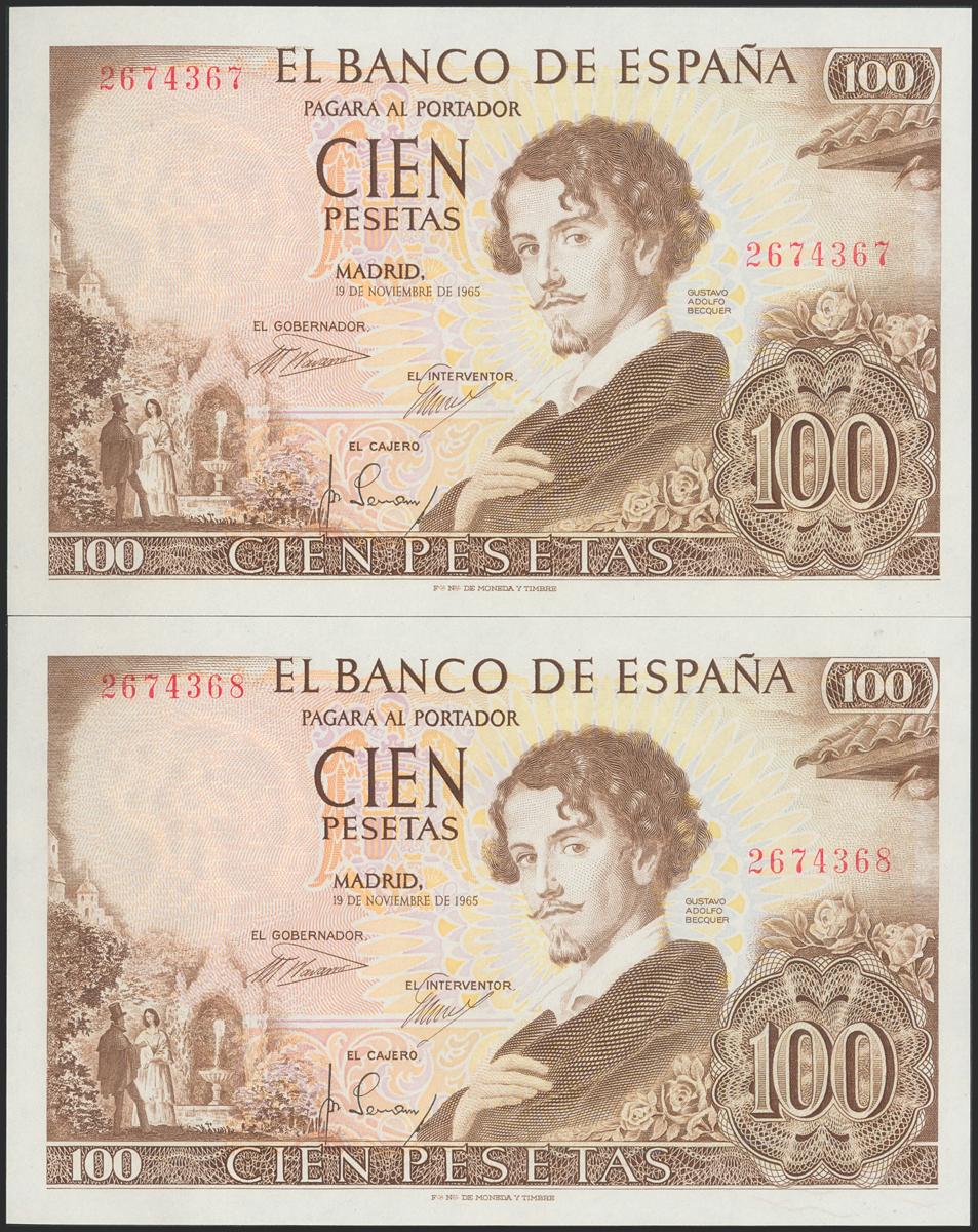 100 Pesetas. 19 de Noviembre de 1965. Pareja correlativa. Sin serie. (Edifil 2017: 470). Apresto original. SC.