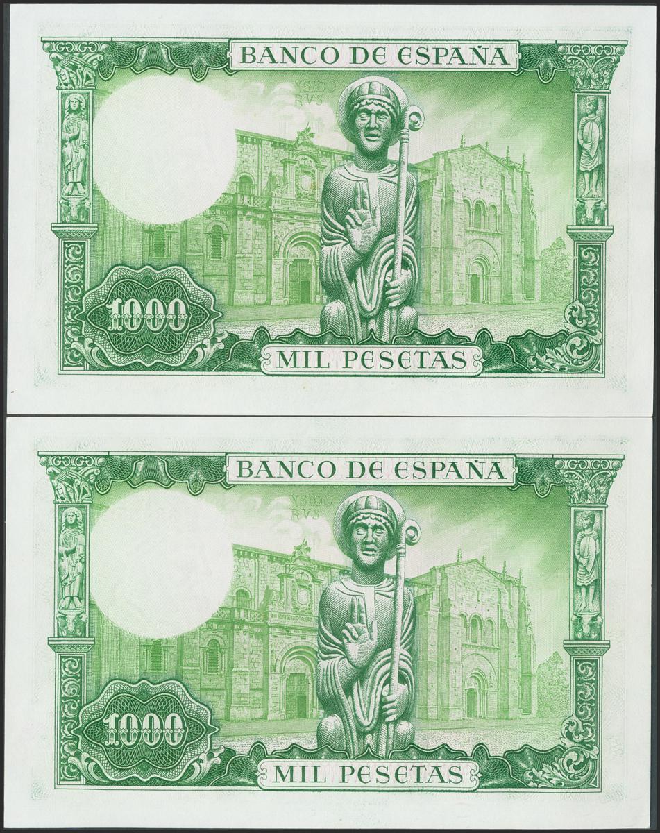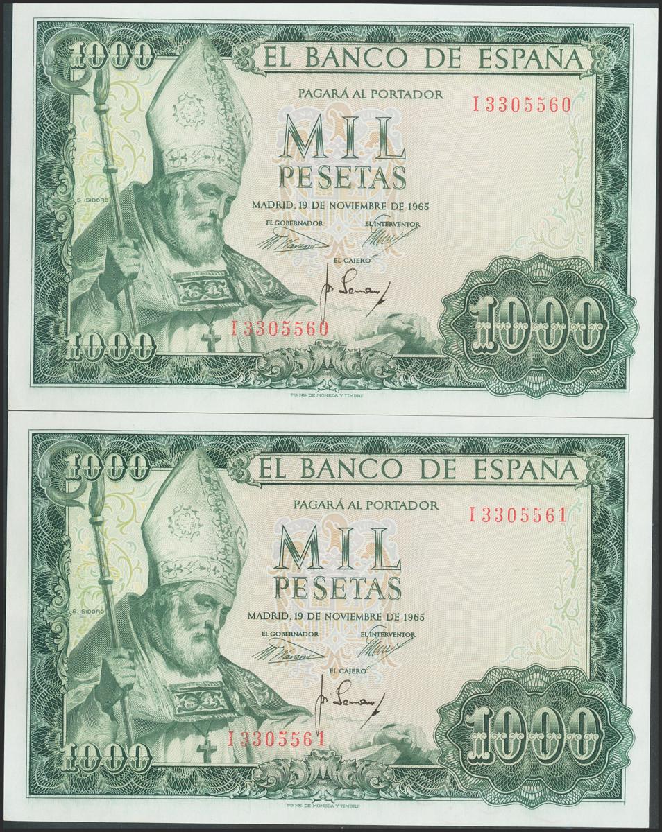1000 Pesetas. 19 de Noviembre de 1965. Pareja correlativa. Serie I. (Edifil 2017: 471b). Conserva todo su apresto original. SC-.