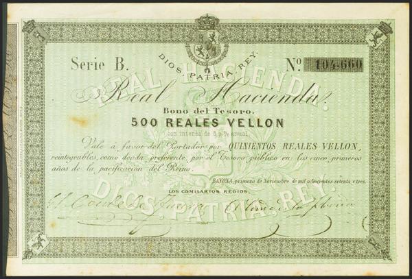 500 Reales de Vellón. Emisión Carlista emitida en Bayona. 1 Noviembre 1873. Serie B. (Edifil 2021: 211). Apresto original, típicos puntitos del tiempo. SC-.