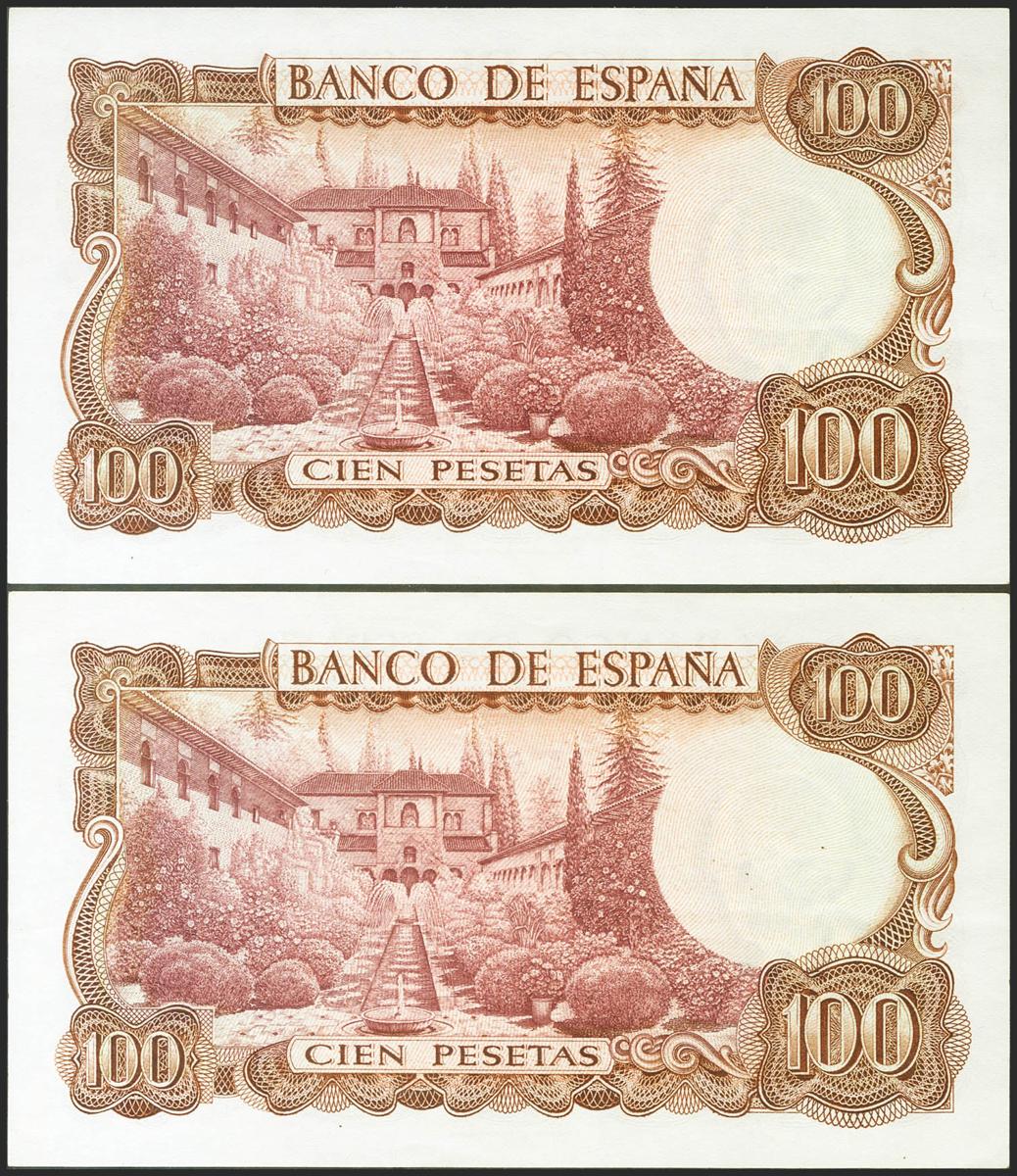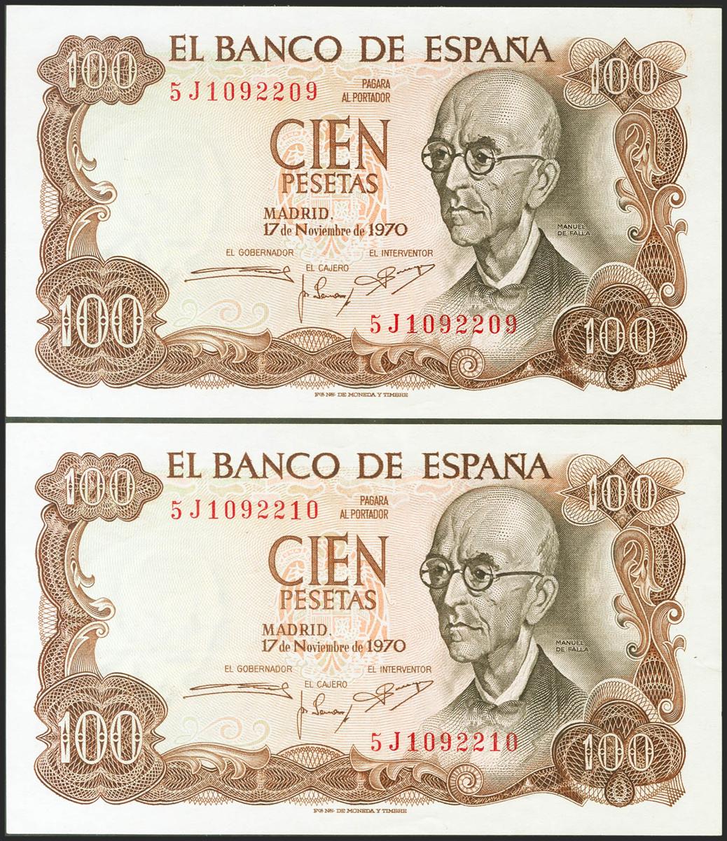 100 Pesetas. 17 de Noviembre de 1970. Pareja correlativa. Serie 5J. (Edifil 2021: 472c). Apresto original. EBC++.