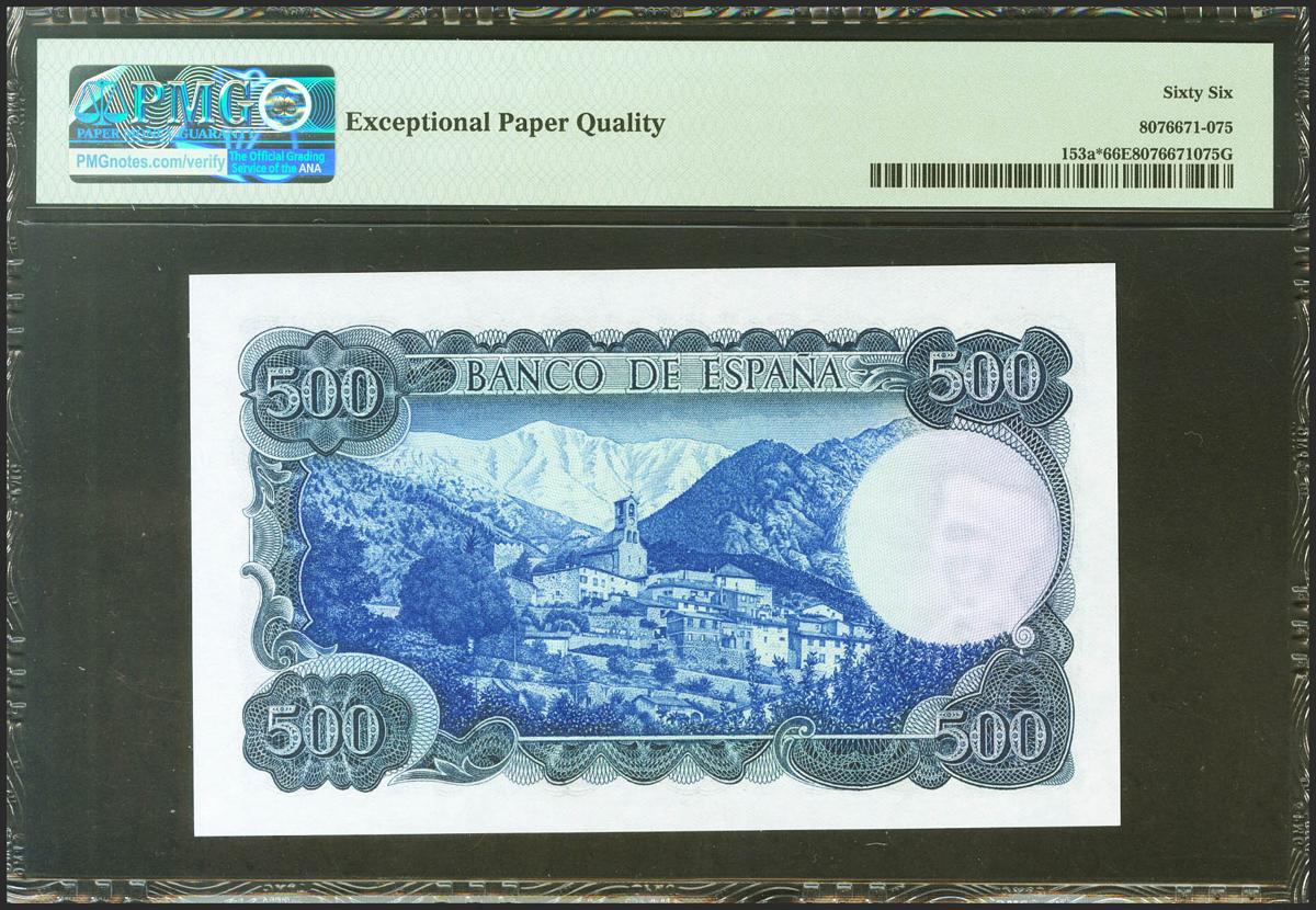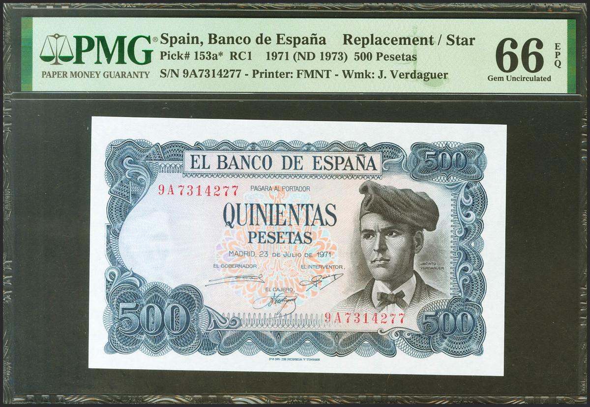 500 Pesetas. 23 de Julio de 1971. Serie especial 9A. (Edifil 2021: 473b, Pick: 153a). Inusual en esta excepcional calidad, apresto original. SC. Encapsulado PMG66EPQ.